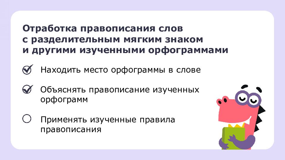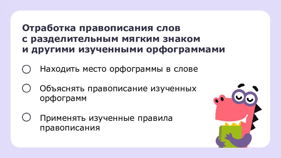 Отработка правописания слов с разделительным мягким знаком и другими изученными орфограммами Находить место орфограммы в слове Объяснять правописание изученных орфограмм Применять изученные правила правописания