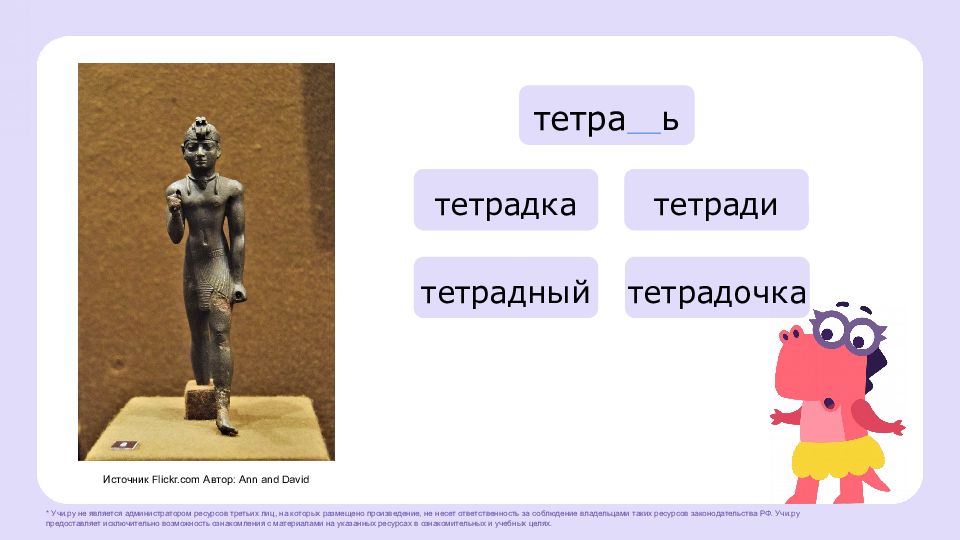 тетра __ ь тетради тетрадный тетрадочка тетрадка Источник Flickr.com Автор: Ann and David * Учи.ру не является администратором ресурсов третьих лиц, на которых размещено произведение, не несет ответственность за соблюдение владельцами таких ресурсов законодательства РФ. Учи.ру предоставляет исключительно возможность ознакомления с материалами на указанных ресурсах в ознакомительных и учебных целях.