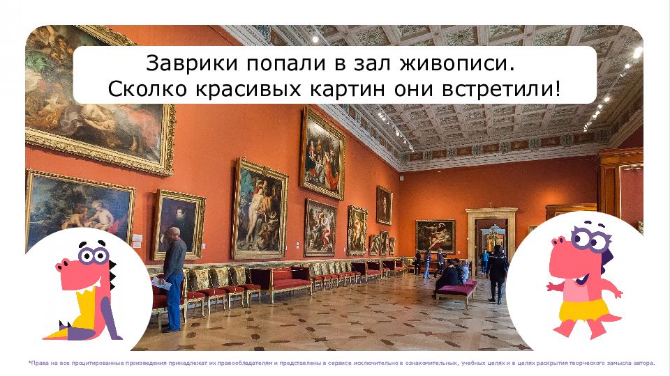 Заврики попали в зал живописи. Сколко красивых картин они встретили! *Права на все процитированные произведения принадлежат их правообладателям и представлены в сервисе исключительно в ознакомительных, учебных целях и в целях раскрытия творческого замысла автора.