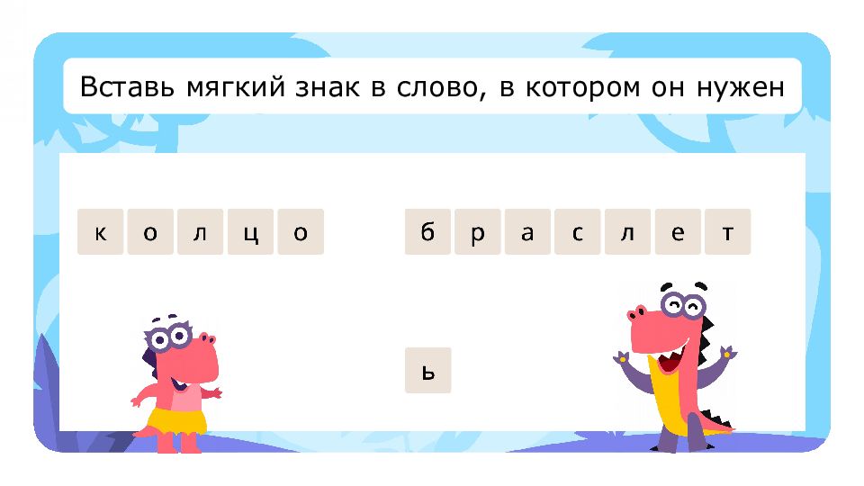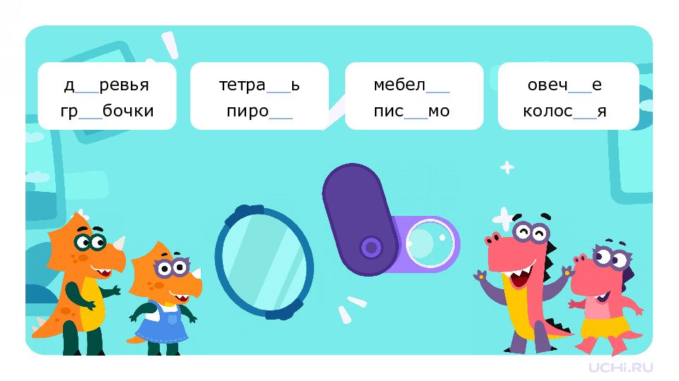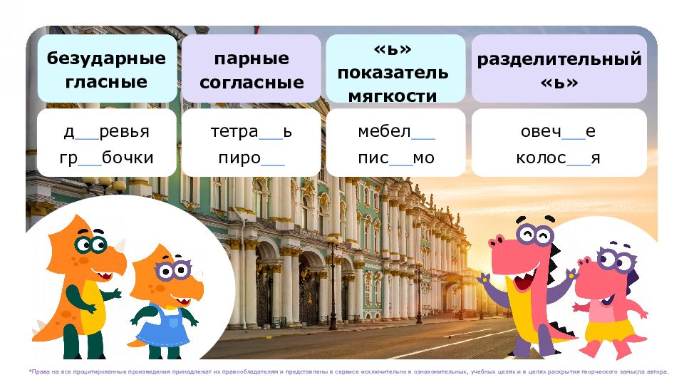 безударные гласные парные согласные «ь» показатель мягкости разделительный «ь» д __ ревья гр __ бочки тетра __ ь пиро __ мебел __ пис __ мо овеч __ е колос __ я *Права на все процитированные произведения принадлежат их правообладателям и представлены в сервисе исключительно в ознакомительных, учебных целях и в целях раскрытия творческого замысла автора.