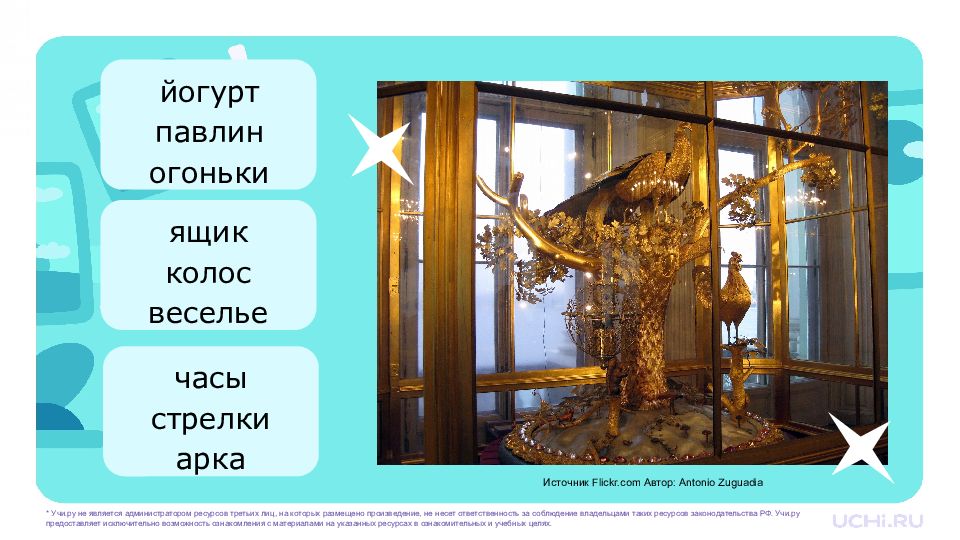 ящик колос веселье йогурт павлин огоньки часы стрелки арка Источник Flickr.com Автор: Antonio Zuguadia * Учи.ру не является администратором ресурсов третьих лиц, на которых размещено произведение, не несет ответственность за соблюдение владельцами таких ресурсов законодательства РФ. Учи.ру предоставляет исключительно возможность ознакомления с материалами на указанных ресурсах в ознакомительных и учебных целях.