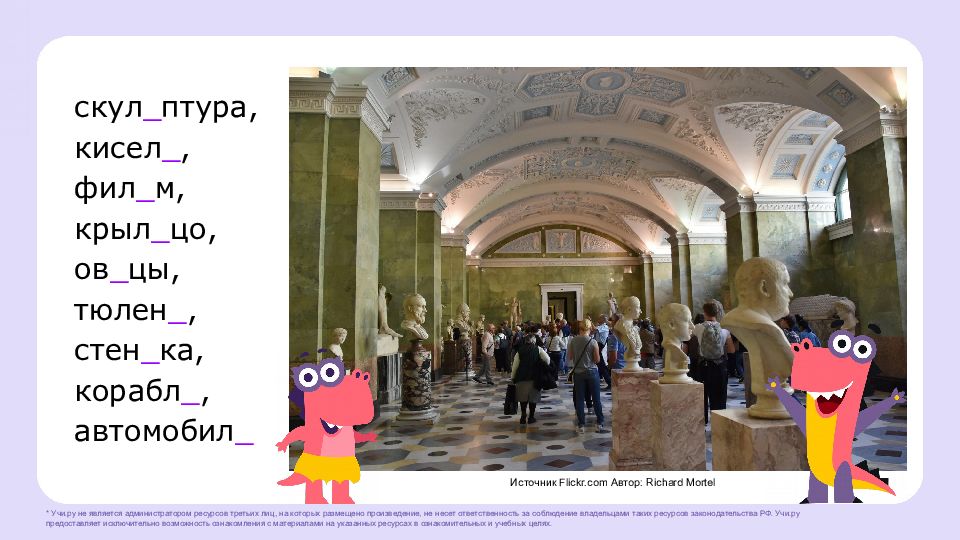 скул _ птура, кисел _, фил _ м, крыл _ цо, ов _ цы, тюлен _, стен _ ка, корабл _, автомобил _ Источник Flickr.com Автор: Richard Mortel * Учи.ру не является администратором ресурсов третьих лиц, на которых размещено произведение, не несет ответственность за соблюдение владельцами таких ресурсов законодательства РФ. Учи.ру предоставляет исключительно возможность ознакомления с материалами на указанных ресурсах в ознакомительных и учебных целях.