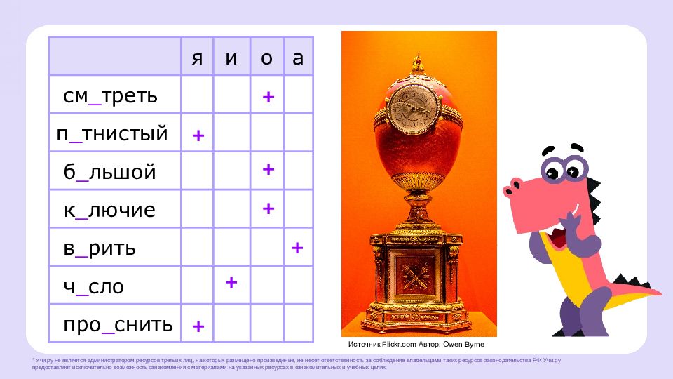 Источник Flickr.com Автор: Owen Byrne я и о а см _ треть п _ тнистый б _ льшой к _ лючие в _ рить ч _ сло про _ снить + + + + + + + * Учи.ру не является администратором ресурсов третьих лиц, на которых размещено произведение, не несет ответственность за соблюдение владельцами таких ресурсов законодательства РФ. Учи.ру предоставляет исключительно возможность ознакомления с материалами на указанных ресурсах в ознакомительных и учебных целях.