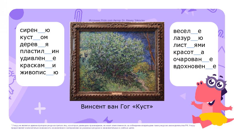 сирен __ ю куст __ ом дерев __ я пластил __ ин удивлен __ е краскам __ и живопис __ ю весел __ е лазур __ ю лист __ ями красот __ а очарован __ е вдохновен __ е Источник Flickr.com Автор: Dr. Alexey Yakovlev Винсент ван Гог «Куст» * Учи.ру не является администратором ресурсов третьих лиц, на которых размещено произведение, не несет ответственность за соблюдение владельцами таких ресурсов законодательства РФ. Учи.ру предоставляет исключительно возможность ознакомления с материалами на указанных ресурсах в ознакомительных и учебных целях.