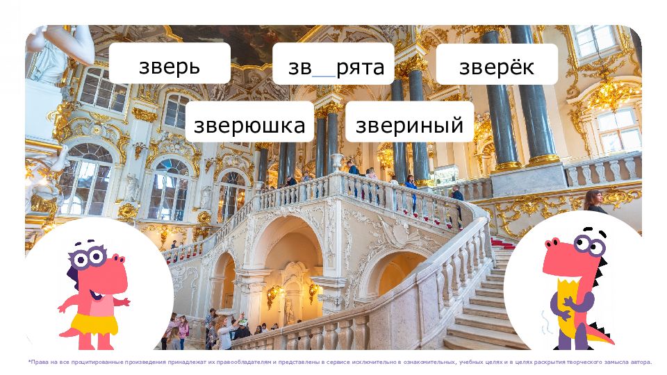 зв __ рята зверь звериный зверёк зверюшка *Права на все процитированные произведения принадлежат их правообладателям и представлены в сервисе исключительно в ознакомительных, учебных целях и в целях раскрытия творческого замысла автора.