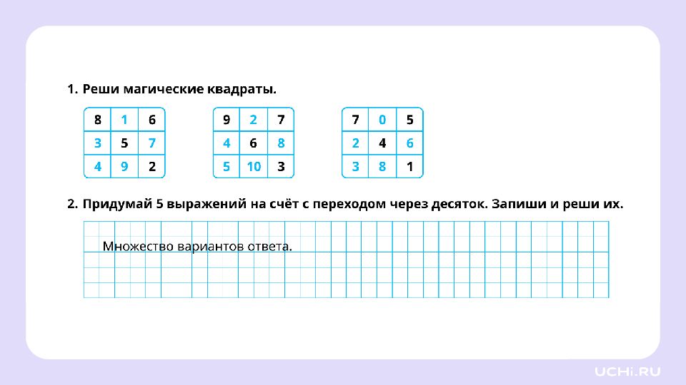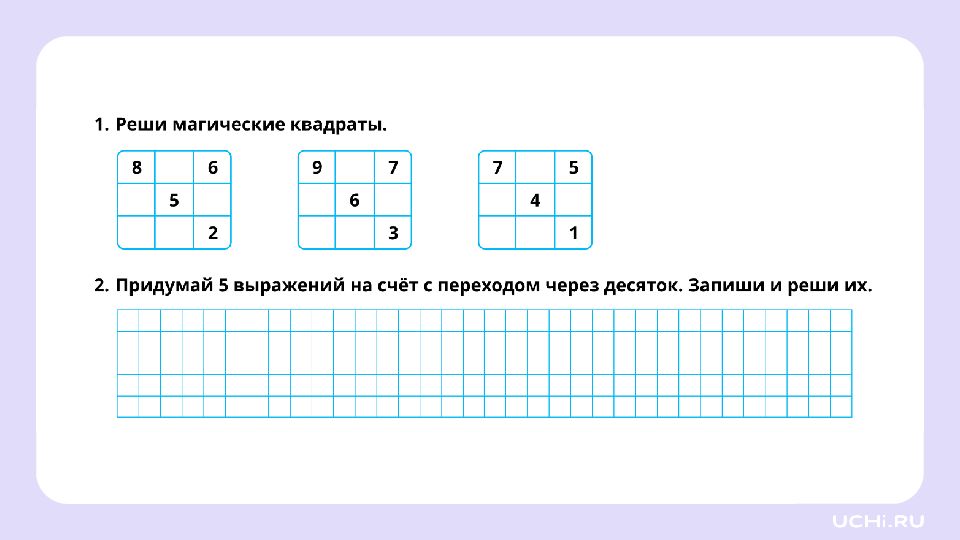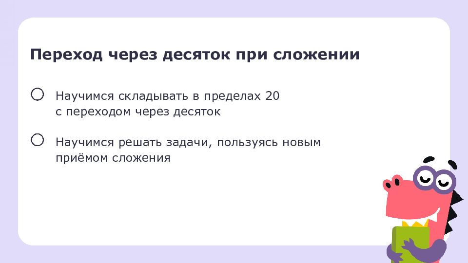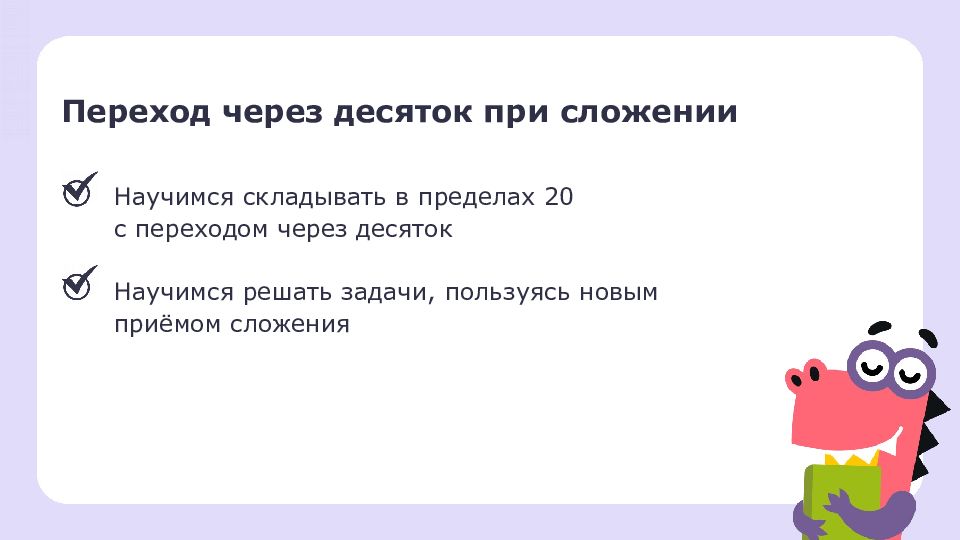 Переход через десяток при сложении Научимся складывать в пределах 20 с переходом через десяток Научимся решать задачи, пользуясь новым приёмом сложения