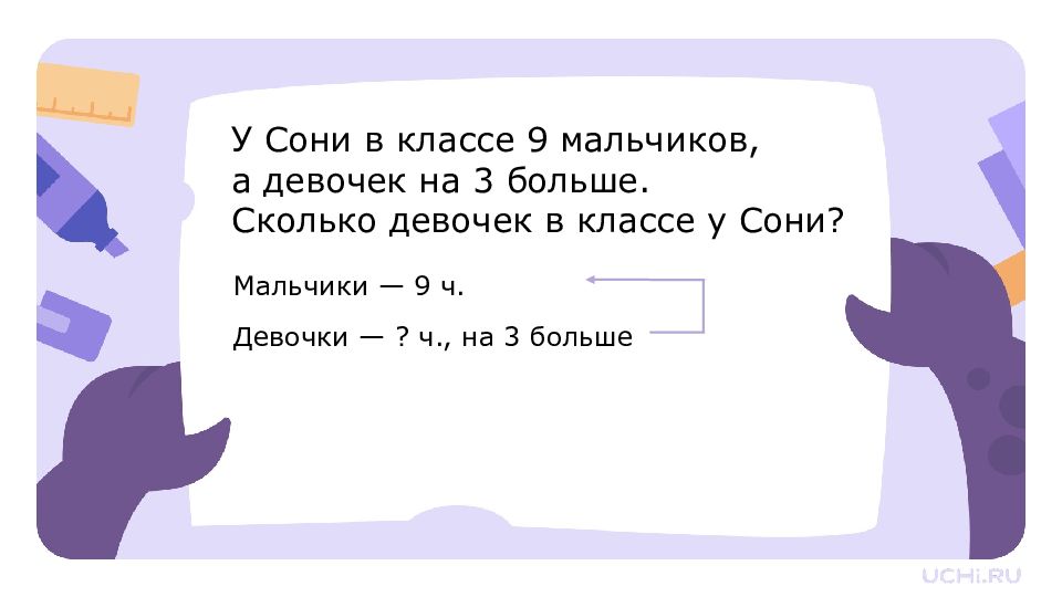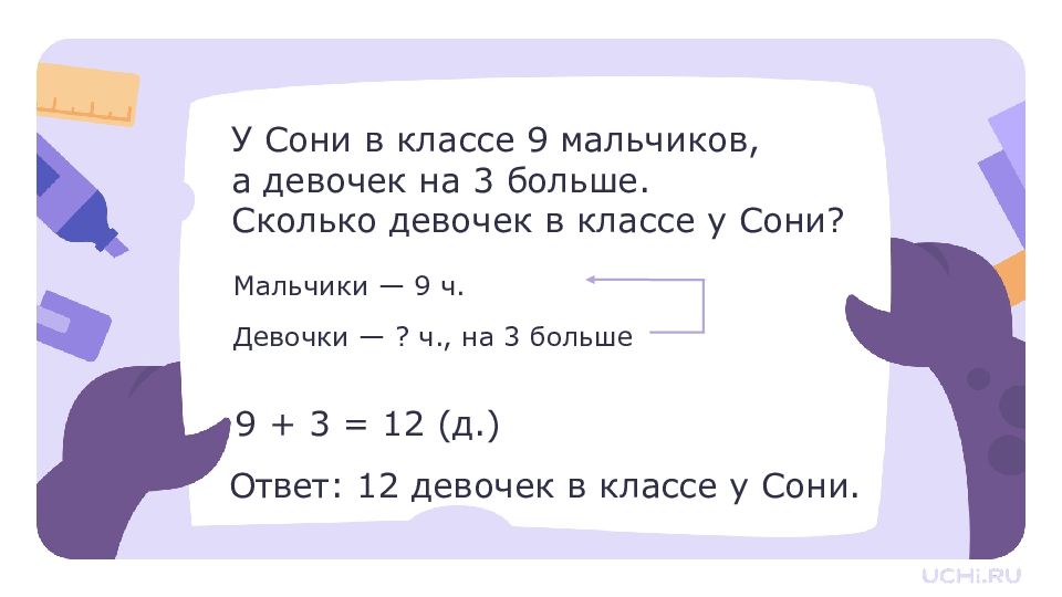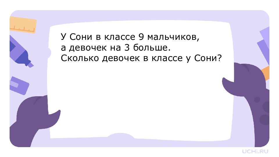 У Сони в классе 9 мальчиков, а девочек на 3 больше. Сколько девочек в классе у Сони? Мальчики — 9 ч. Девочки — ? ч., на 3 больше 9 + 3 = 12 (д.) Ответ: 12 девочек в классе у Сони.