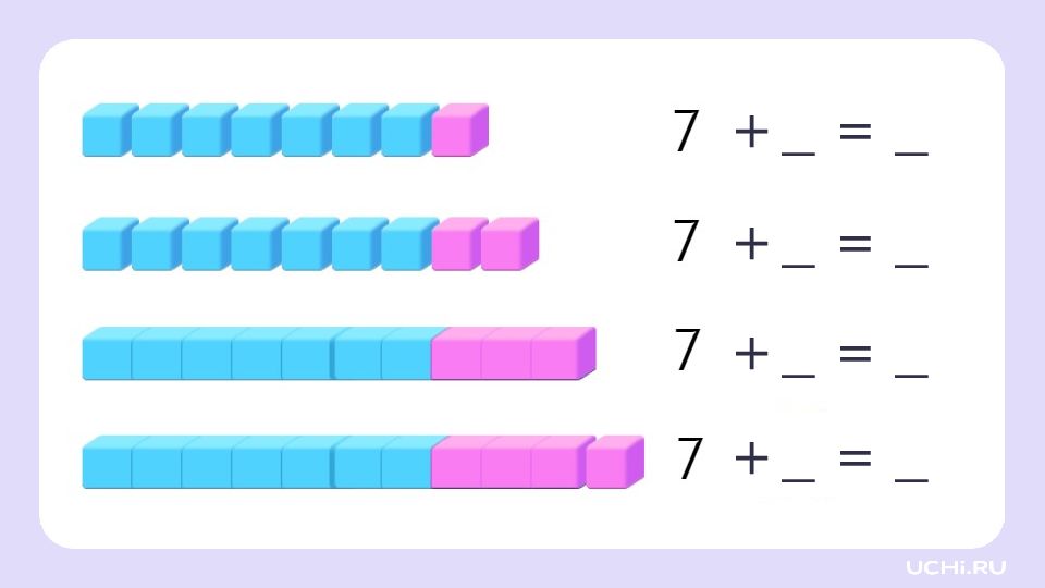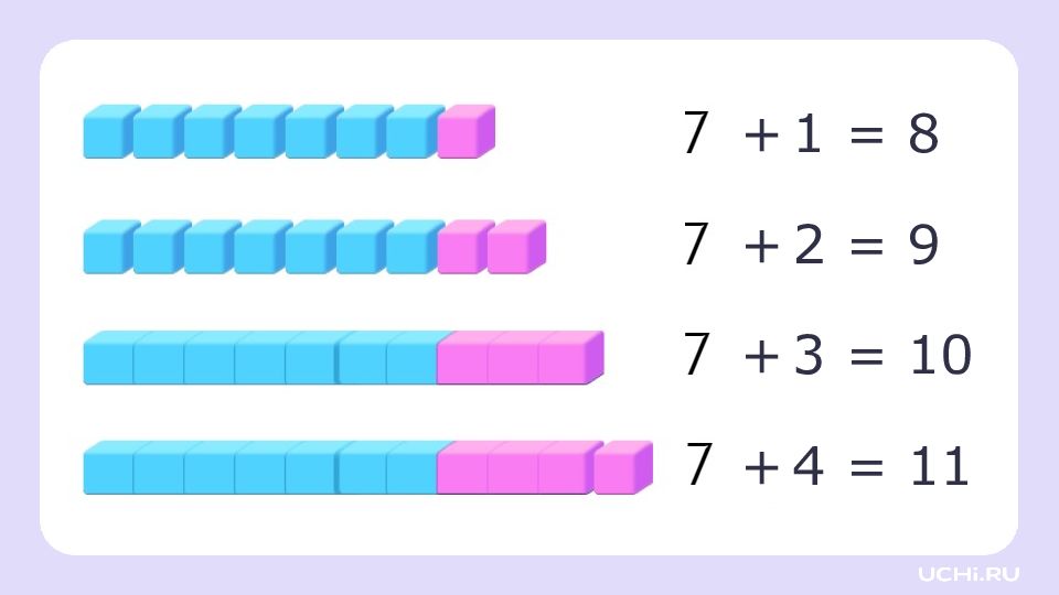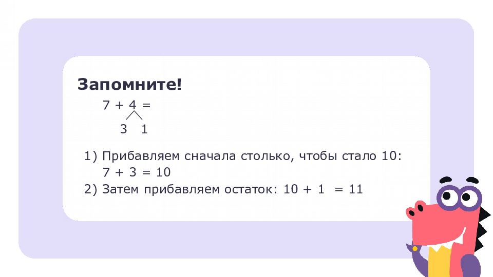 Запомните! 7 + 4 = Прибавляем сначала столько, чтобы стало 10: 7 + 3 = 10 Затем прибавляем остаток: 10 + 1 = 11 3 1
