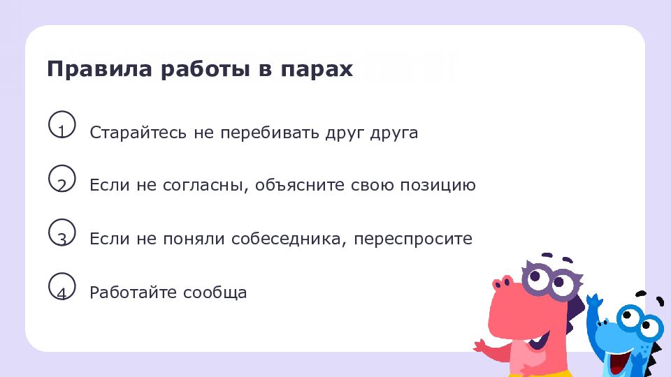 Правила работы в парах Старайтесь не перебивать друг друга Если не согласны, объясните свою позицию Если не поняли собеседника, переспросите Работайте сообща 1 2 3 4