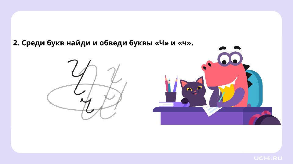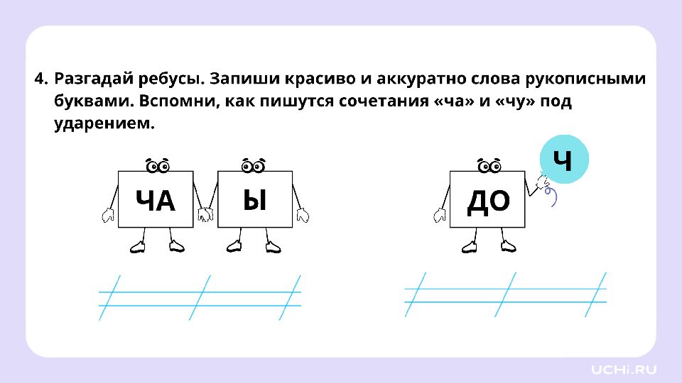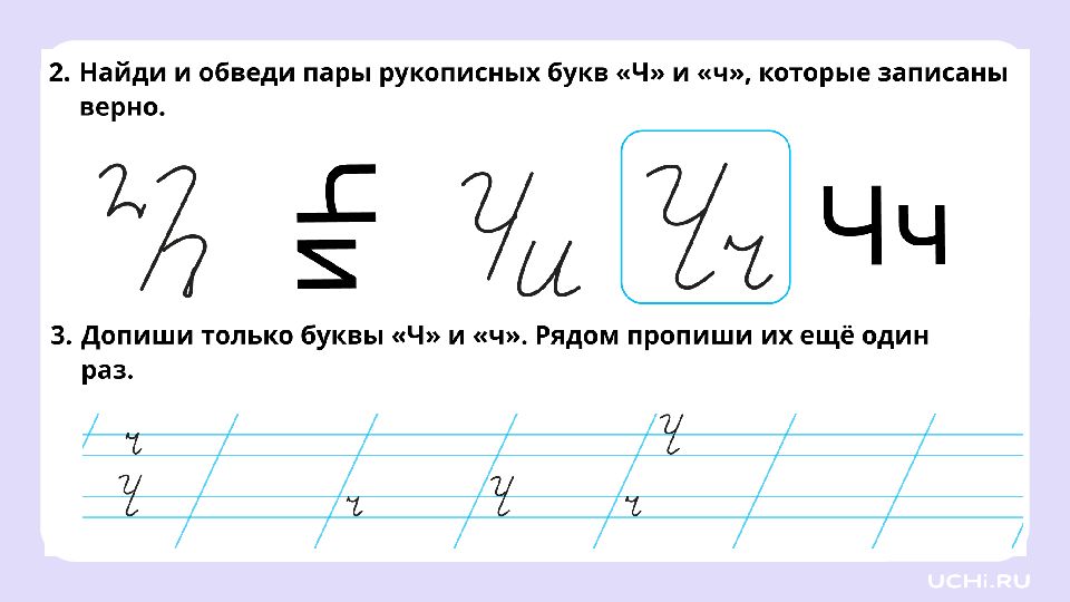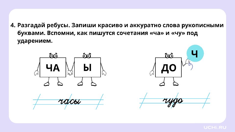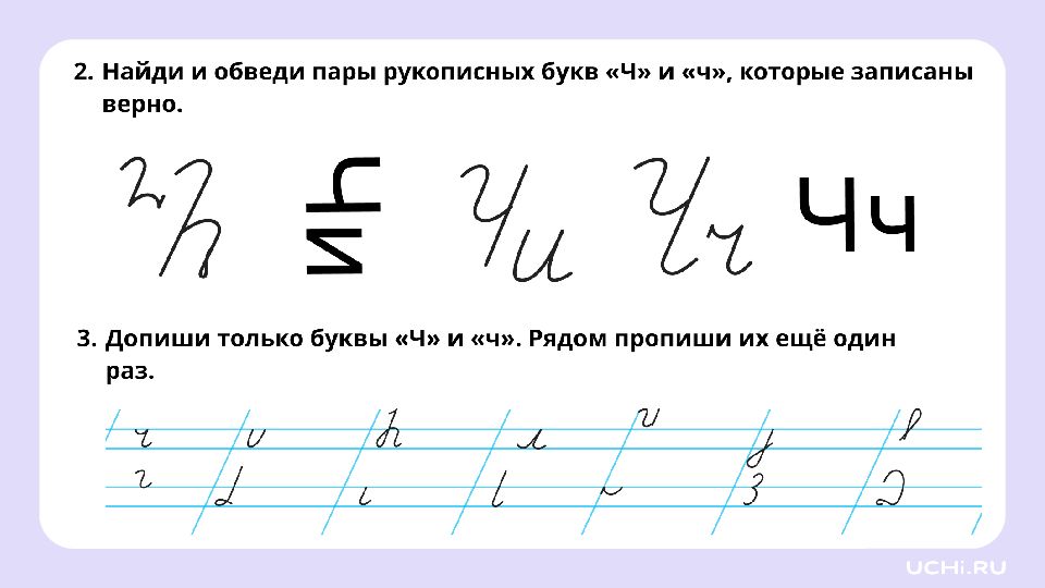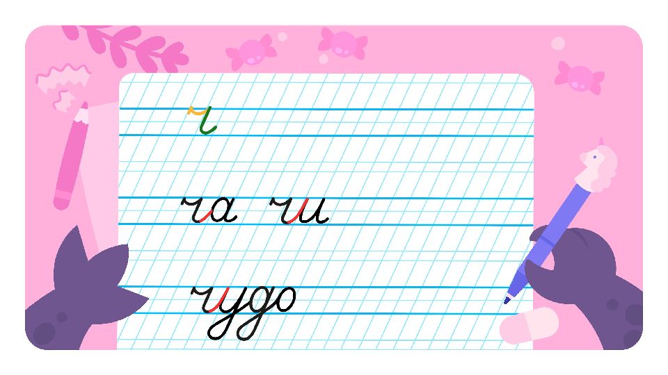 Письмо строчной и заглавной букв «Ч», «ч» Различать звук [ч ’ ] в словах и давать ему характеристику Узнавать графическое изображение букв «Ч», «ч» Писать аккуратным разборчивым почерком буквы «Ч», «ч»