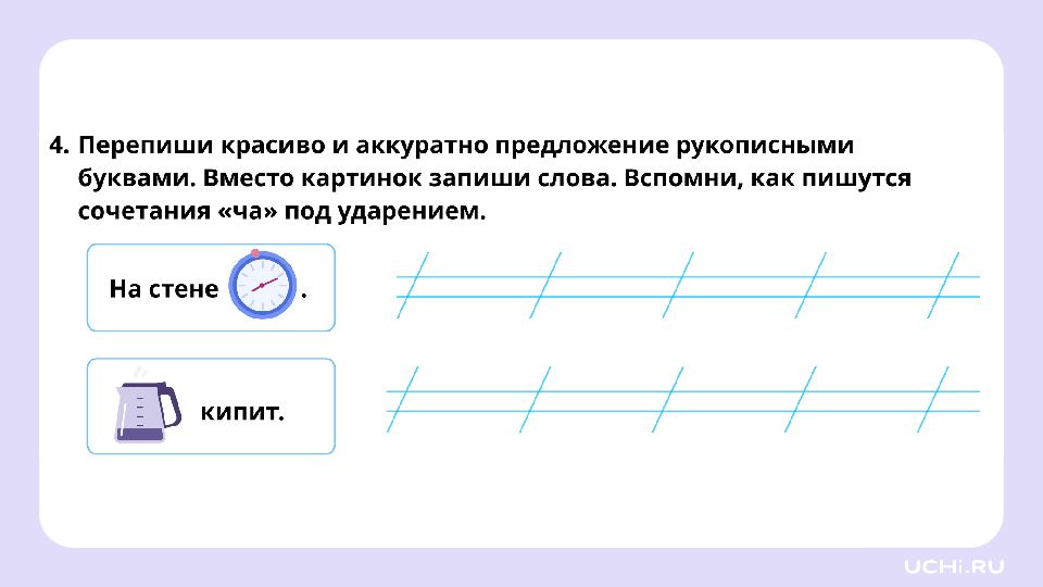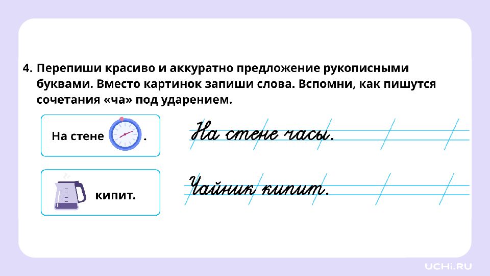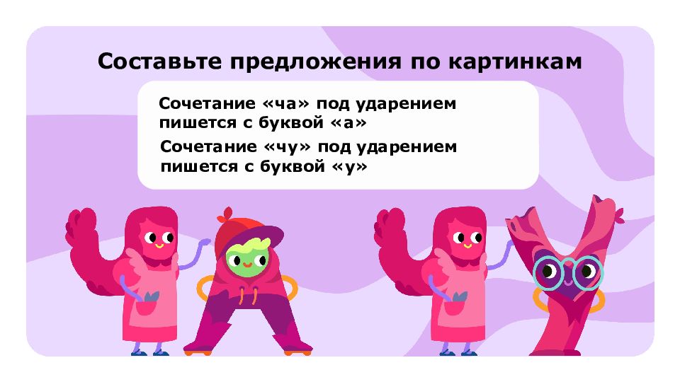 Составьте предложения по картинкам Сочетание «ча» под ударением пишется с буквой «а» Сочетание «чу» под ударением пишется с буквой «у»