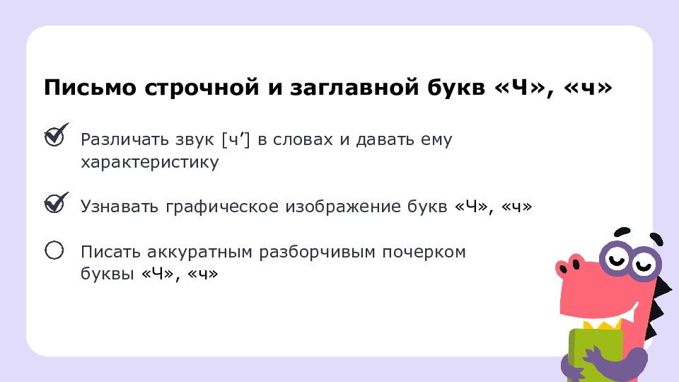 Письмо строчной и заглавной букв «Ч», «ч» Различать звук [ч’] в словах и давать ему характеристику Узнавать графическое изображение букв «Ч», «ч» Писать аккуратным разборчивым почерком буквы «Ч», «ч»