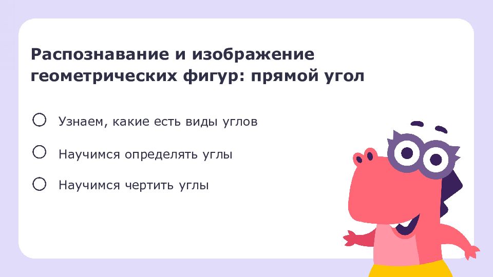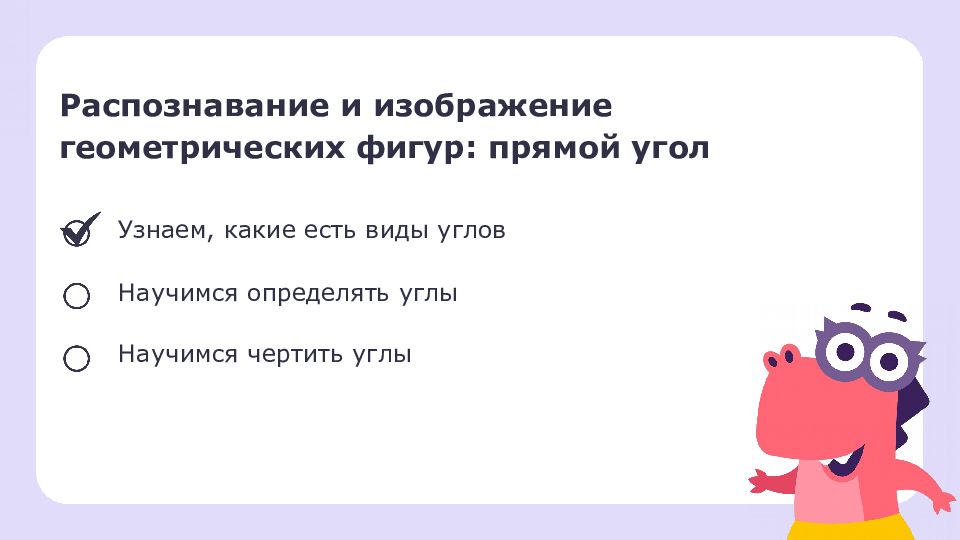 Узнаем, какие есть виды углов Научимся определять углы Научимся чертить углы Распознавание и изображение геометрических фигур: прямой угол