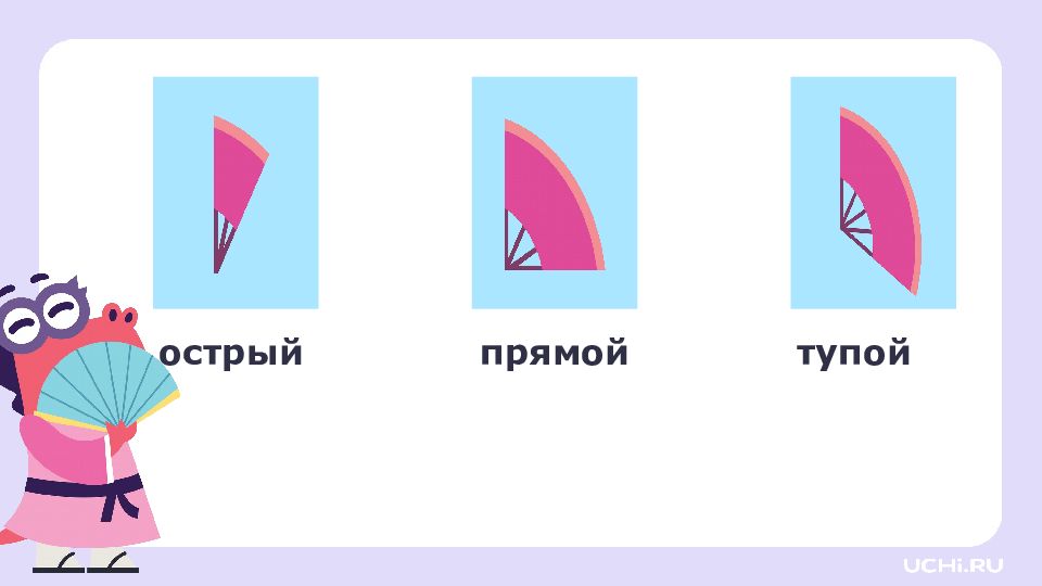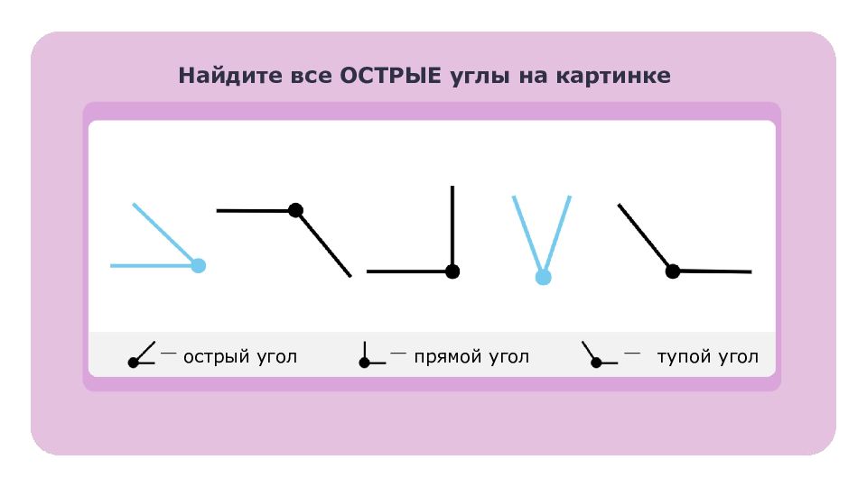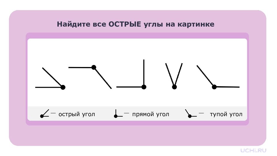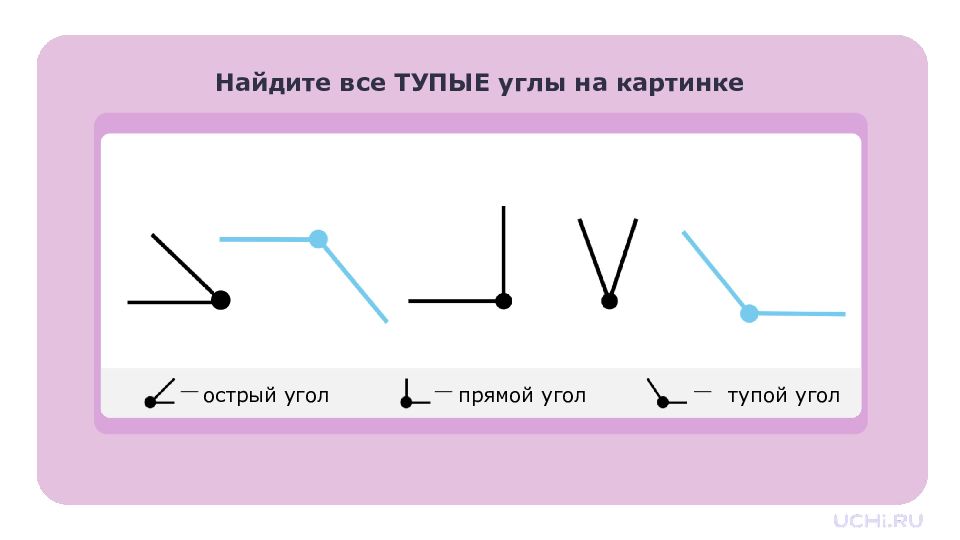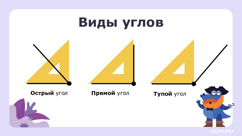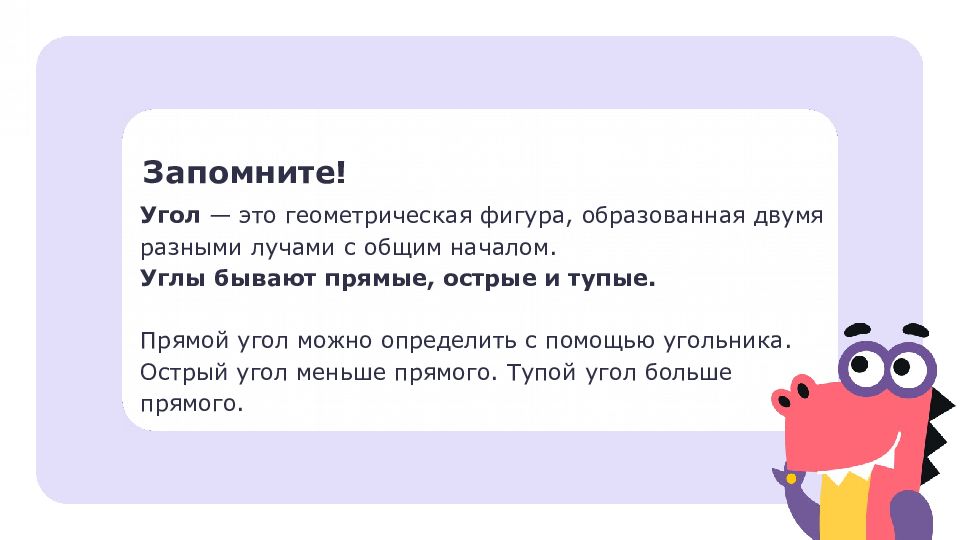 Запомните! Угол — это геометрическая фигура, образованная двумя разными лучами с общим началом. Углы бывают прямые, острые и тупые. Прямой угол можно определить с помощью угольника. Острый угол меньше прямого. Тупой угол больше прямого.