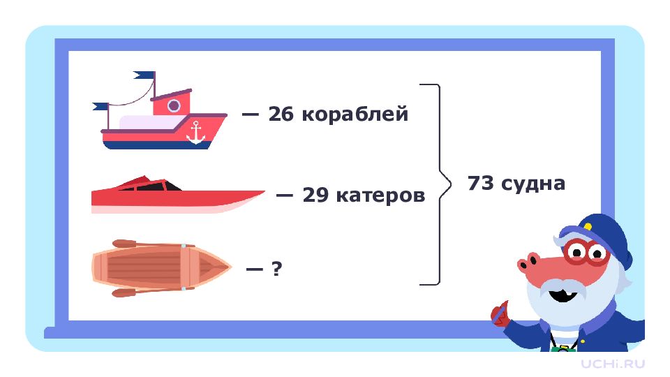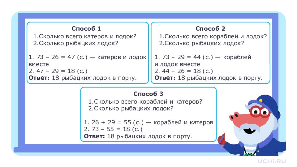 Способ 1 Способ 3 Способ 2 Сколько всего катеров и лодок? Сколько рыбацких лодок? 1. 73 – 26 = 47 (с.) — катеров и лодок вместе 2. 47 – 29 = 18 (с.) Ответ: 18 рыбацких лодок в порту. Сколько всего кораблей и катеров? Сколько рыбацких лодок? 1. 26 + 29 = 55 (с.) — кораблей и катеров 2. 73 – 55 = 18 (с.) Ответ: 18 рыбацких лодок в порту. Сколько всего кораблей и лодок? Сколько рыбацких лодок? 1. 73 – 29 = 44 (с.) — кораблей и лодок вместе 2. 44 – 26 = 18 (с.) Ответ: 18 рыбацких лодок в порту.