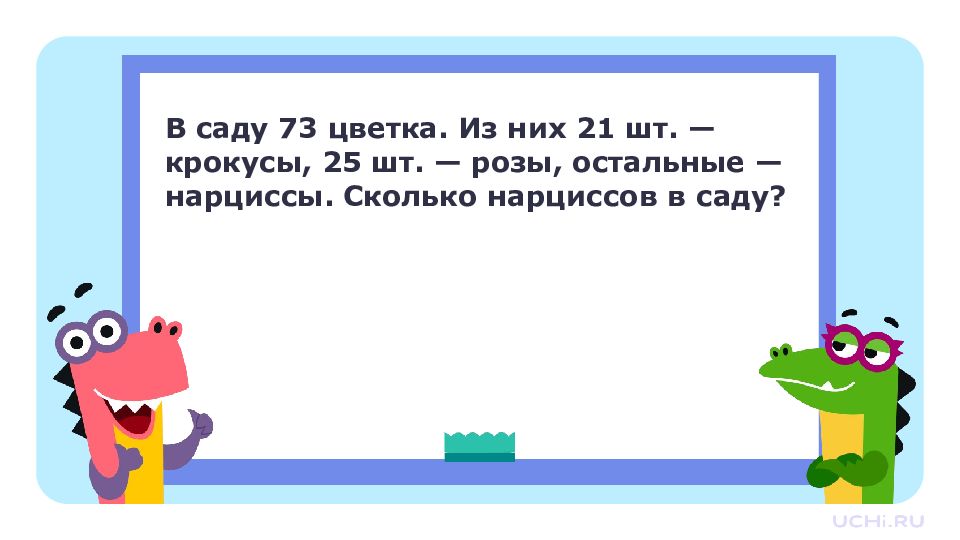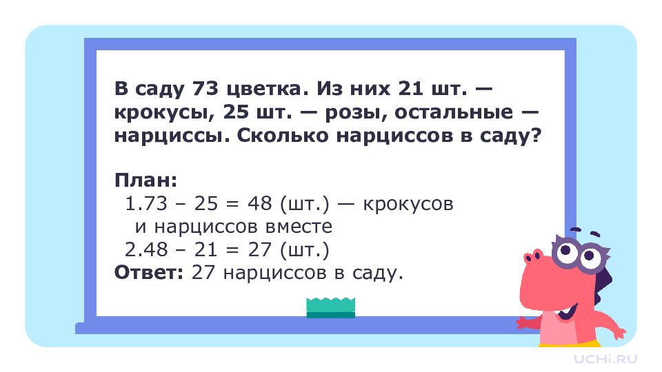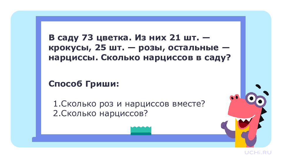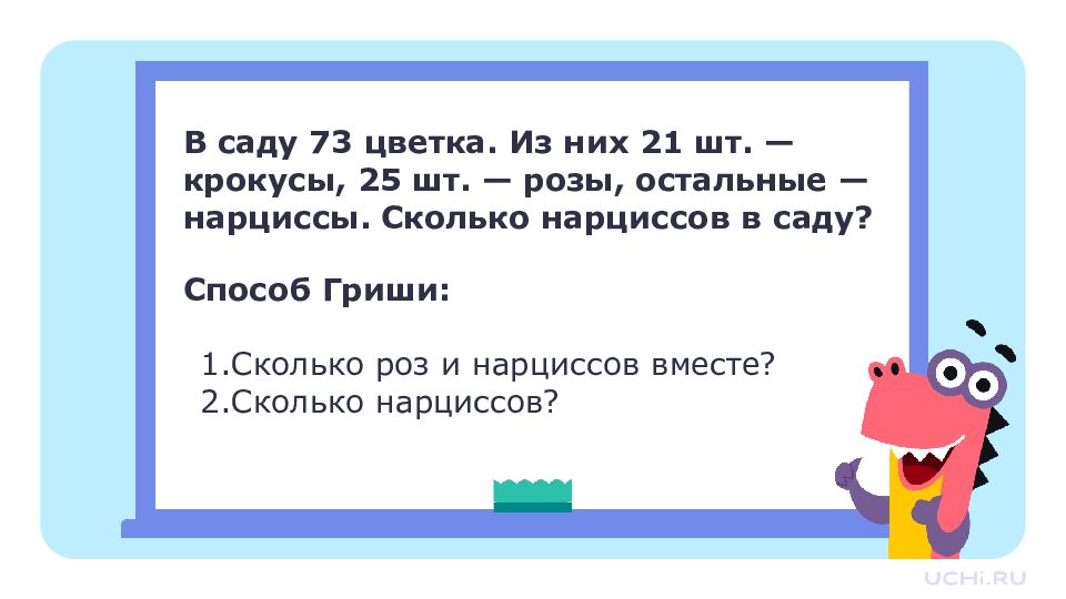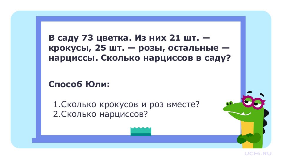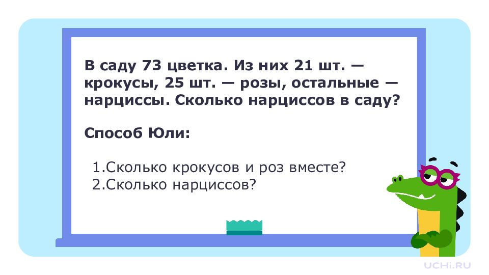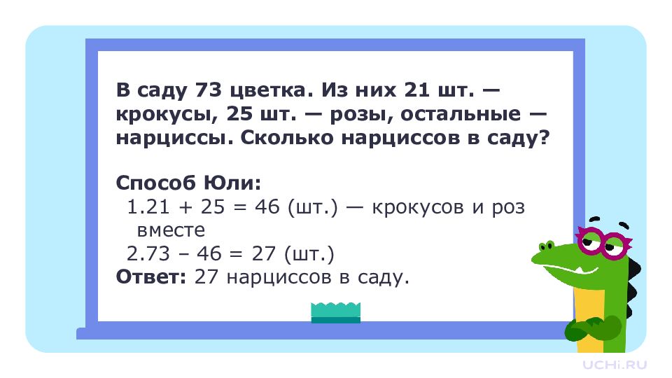 В саду 73 цветка. Из них 21 шт. — крокусы, 25 шт. — розы, остальные — нарциссы. Сколько нарциссов в саду? Способ Юли: 21 + 25 = 46 (шт.) — крокусов и роз вместе 73 – 46 = 27 (шт.) Ответ: 27 нарциссов в саду.
