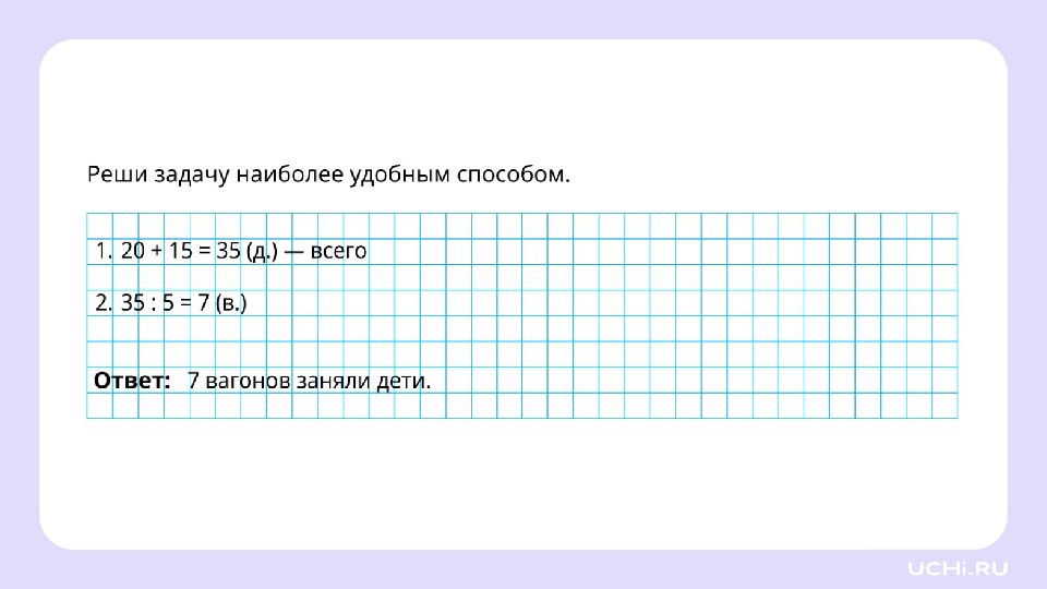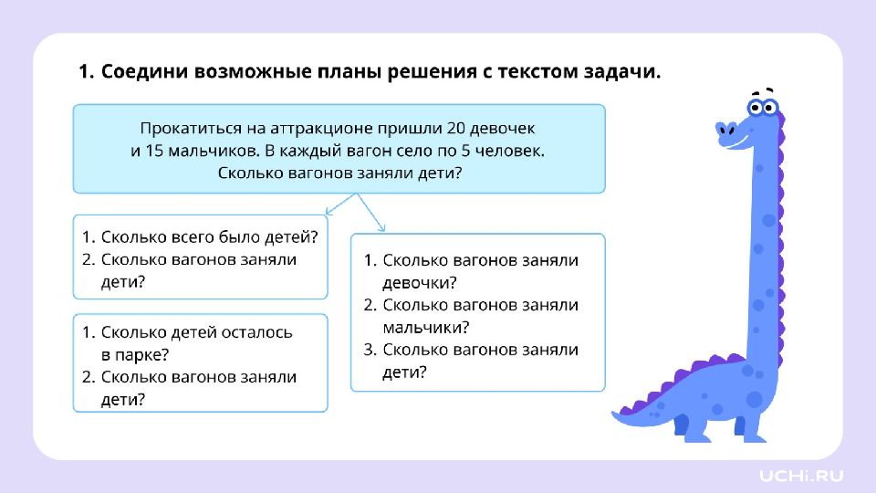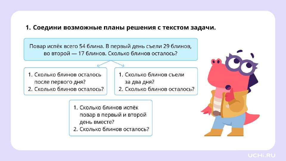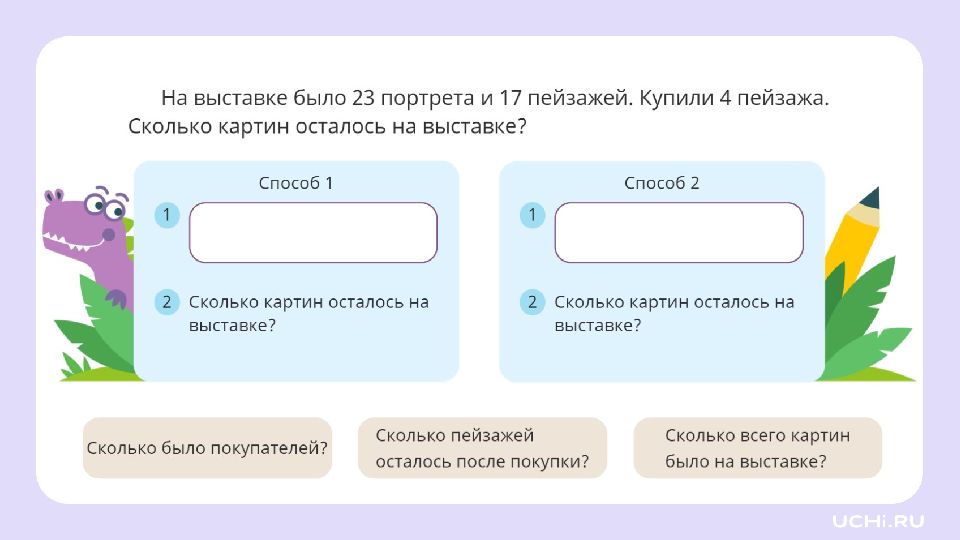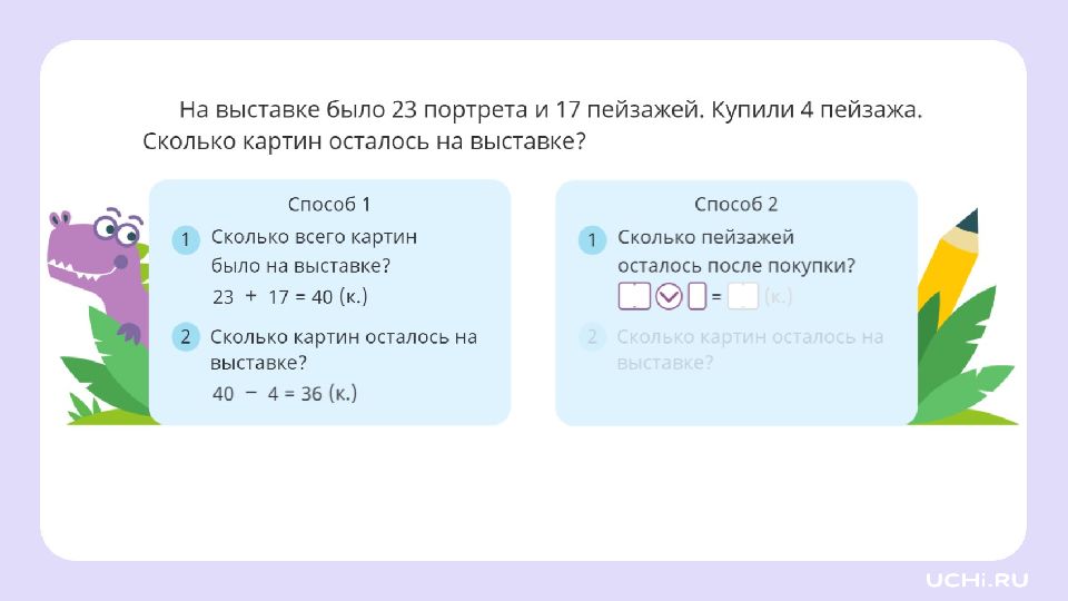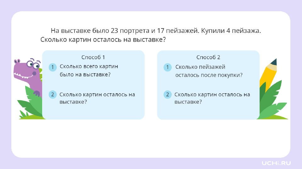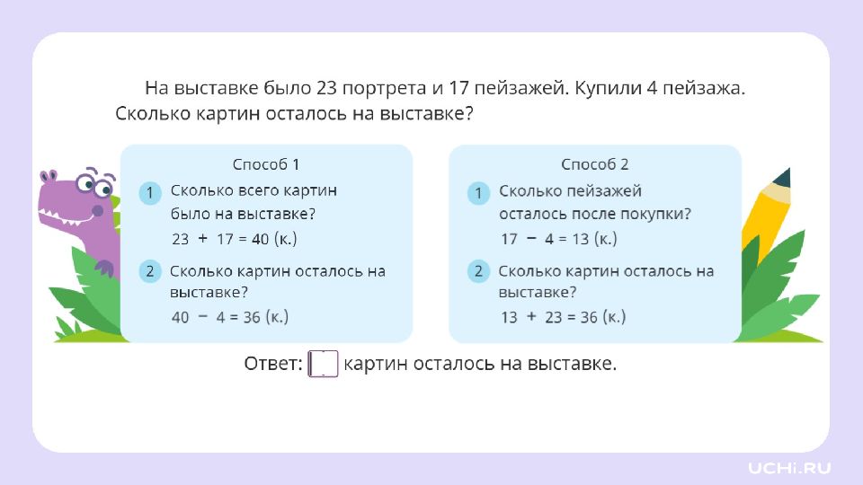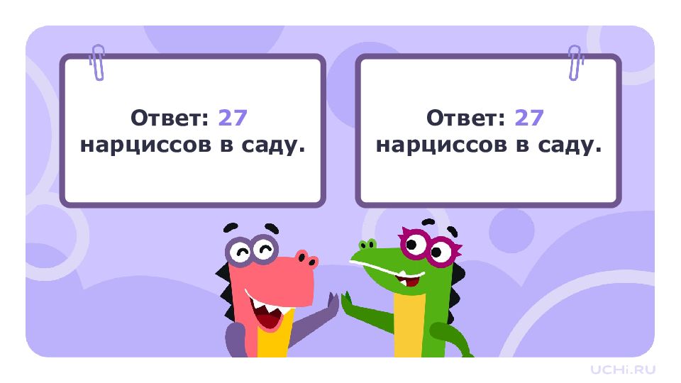 В саду 73 цветка. Из них 21 шт. — крокусы, 25 шт. — розы, остальные — нарциссы. Сколько нарциссов в саду? Способ Юли: 21 + 25 = 46 (шт.) — крокусов и роз вместе 73 – 46 = 27 (шт.) Ответ: 27 нарциссов в саду.