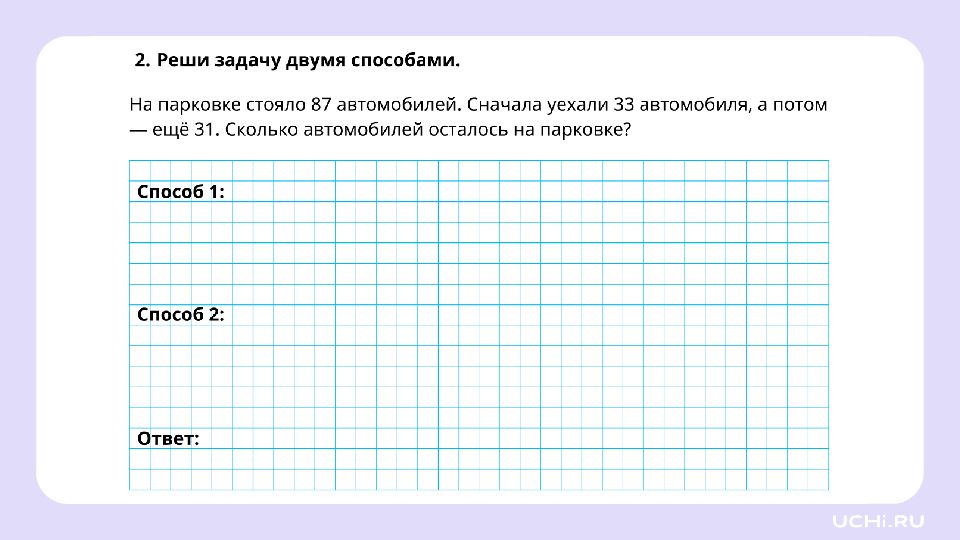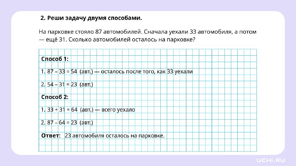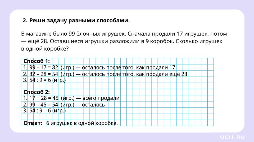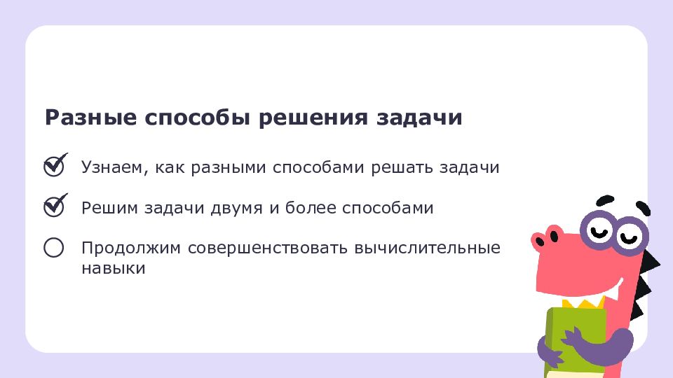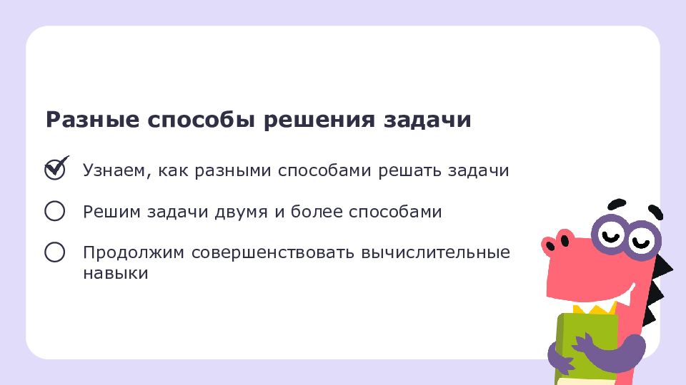 Разные способы решения задачи Узнаем, как разными способами решать задачи Решим задачи двумя и более способами Продолжим совершенствовать вычислительные навыки