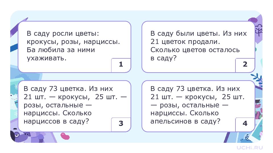 В саду росли цветы: крокусы, розы, нарциссы. Ба любила за ними ухаживать. 1 В саду были цветы. Из них 21 цветок продали. Сколько цветов осталось в саду? 2 4 В саду 73 цветка. Из них 21 шт. — крокусы, 25 шт. — розы, остальные — нарциссы. Сколько апельсинов в саду? В саду 73 цветка. Из них 21 шт. — крокусы, 25 шт. — розы, остальные — нарциссы. Сколько нарциссов в саду? 3