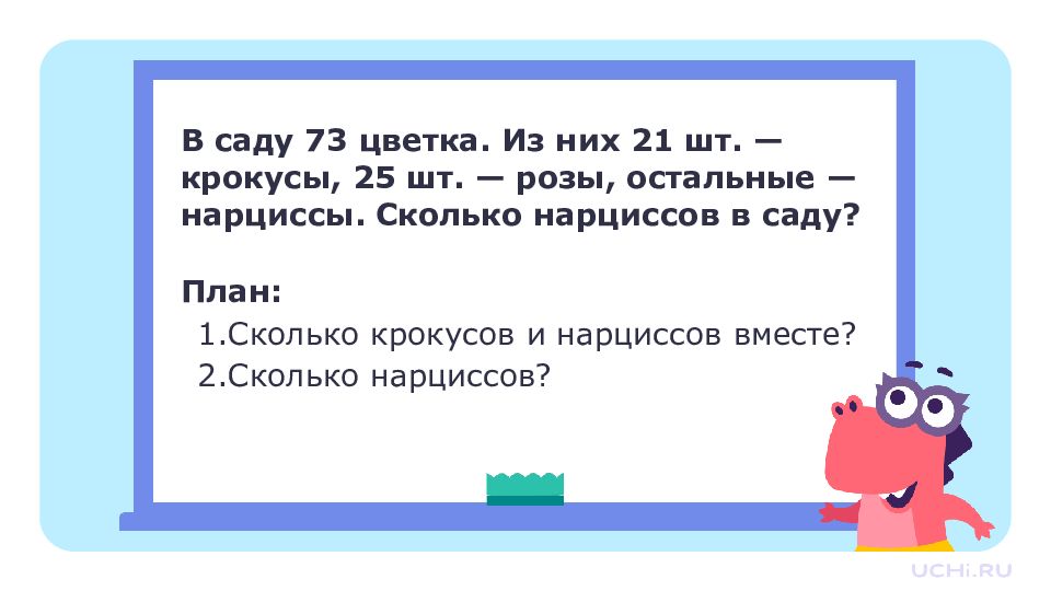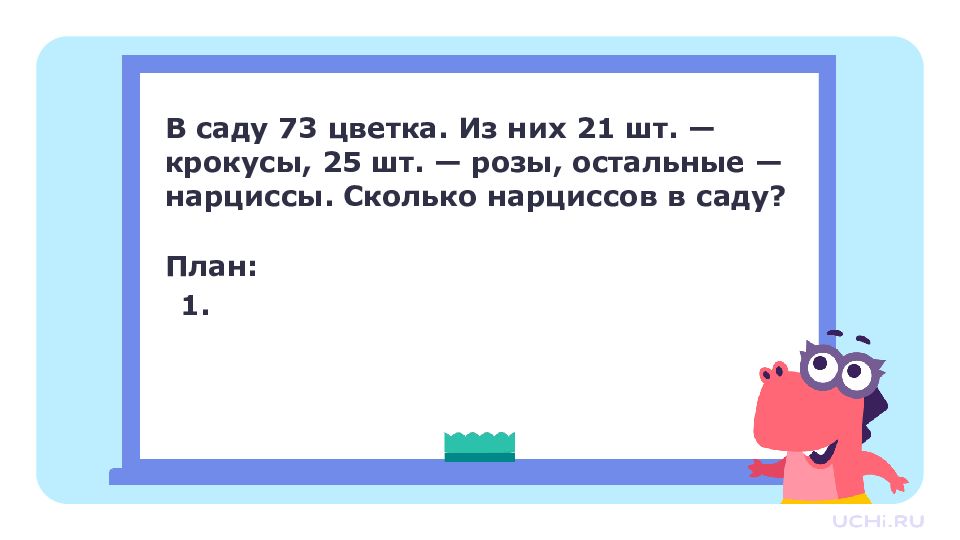 В саду 73 цветка. Из них 21 шт. — крокусы, 25 шт. — розы, остальные — нарциссы. Сколько нарциссов в саду? План: