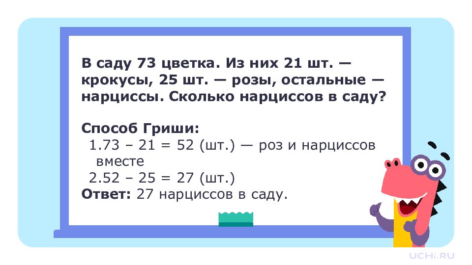 В саду 73 цветка. Из них 21 шт. — крокусы, 25 шт. — розы, остальные — нарциссы. Сколько нарциссов в саду? Способ Гриши: 73 – 21 = 52 (шт.) — роз и нарциссов вместе 52 – 25 = 27 (шт.) Ответ: 27 нарциссов в саду.