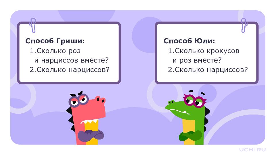 Способ Гриши: Сколько роз и нарциссов вместе? Сколько нарциссов? Способ Юли: Сколько крокусов и роз вместе? Сколько нарциссов?