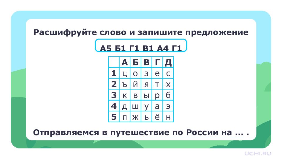 Расшифруйте слово и запишите предложение Отправляемся в путешествие по России на.... А5 Б1 Г1 В1 А4 Г1