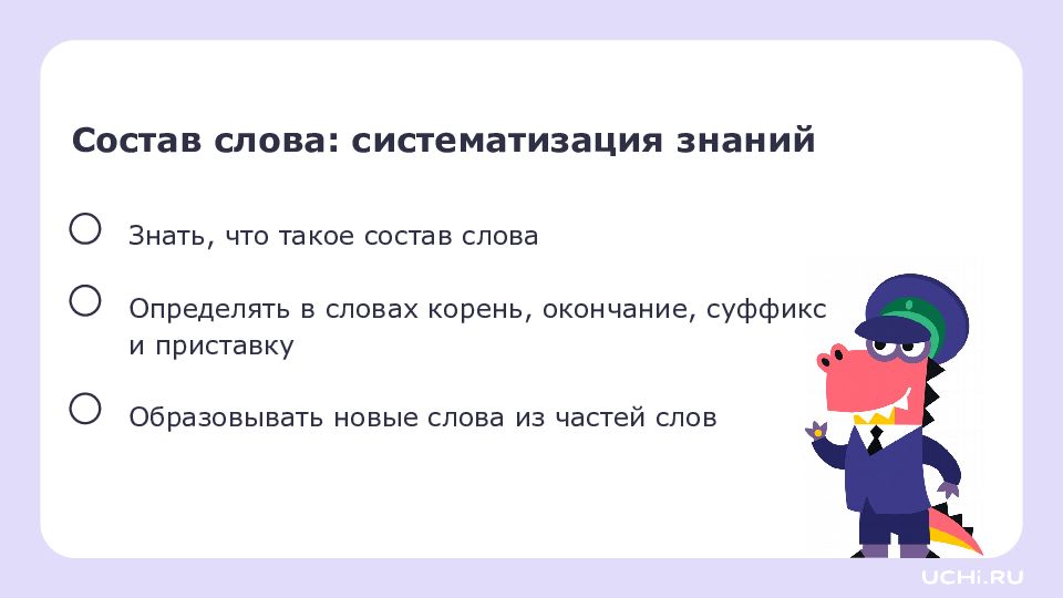 Состав слова: систематизация знаний Знать, что такое состав слова Определять в словах корень, окончание, суффикс и приставку Образовывать новые слова из частей слов