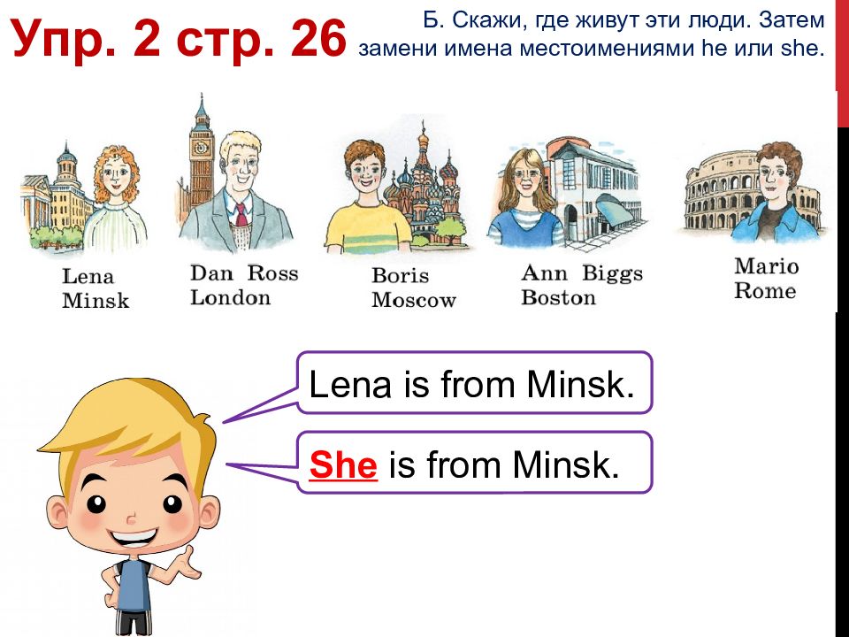 Упр. 2 стр. 26 Б. Скажи, где живут эти люди. Затем замени имена местоимениями he или she. Lena is from Minsk. She is from Minsk.