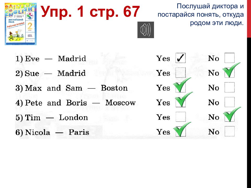 Упр. 1 стр. 67 Послушай диктора и постарайся понять, откуда родом эти люди.