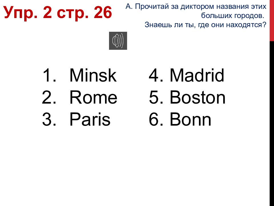 Minsk Rome Paris 4. Madrid 5. Boston 6. Bonn Упр. 2 стр. 26 А. Прочитай за диктором названия этих больших городов. Знаешь ли ты, где они находятся?