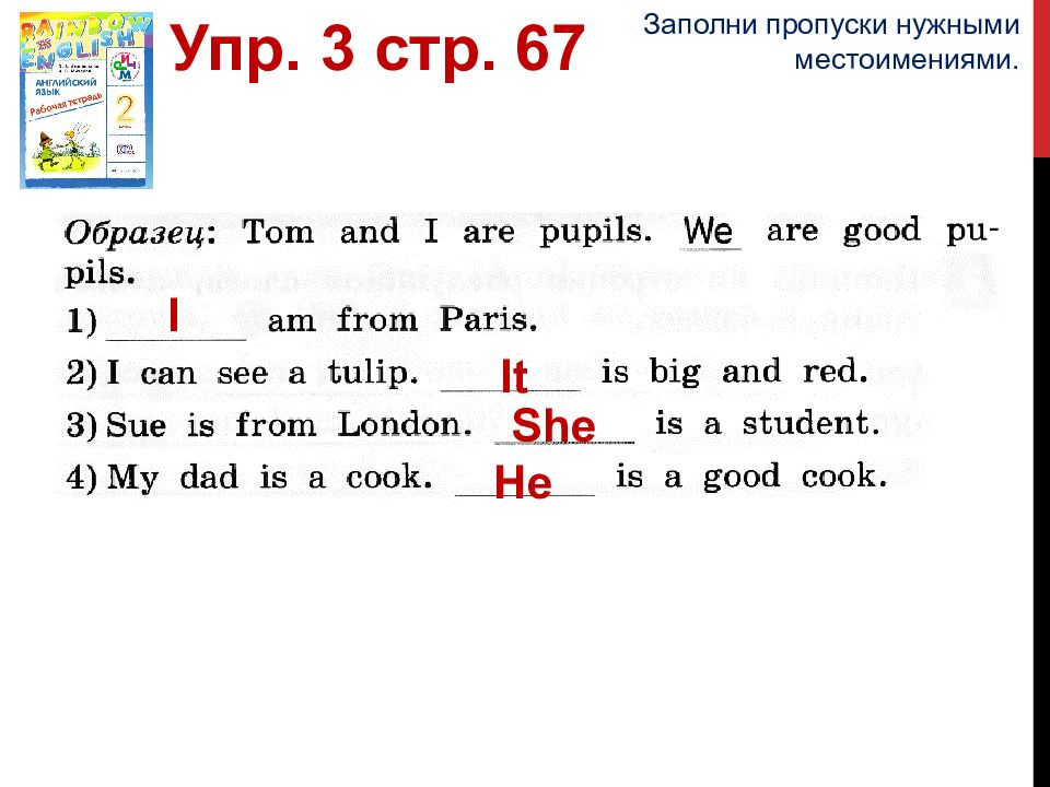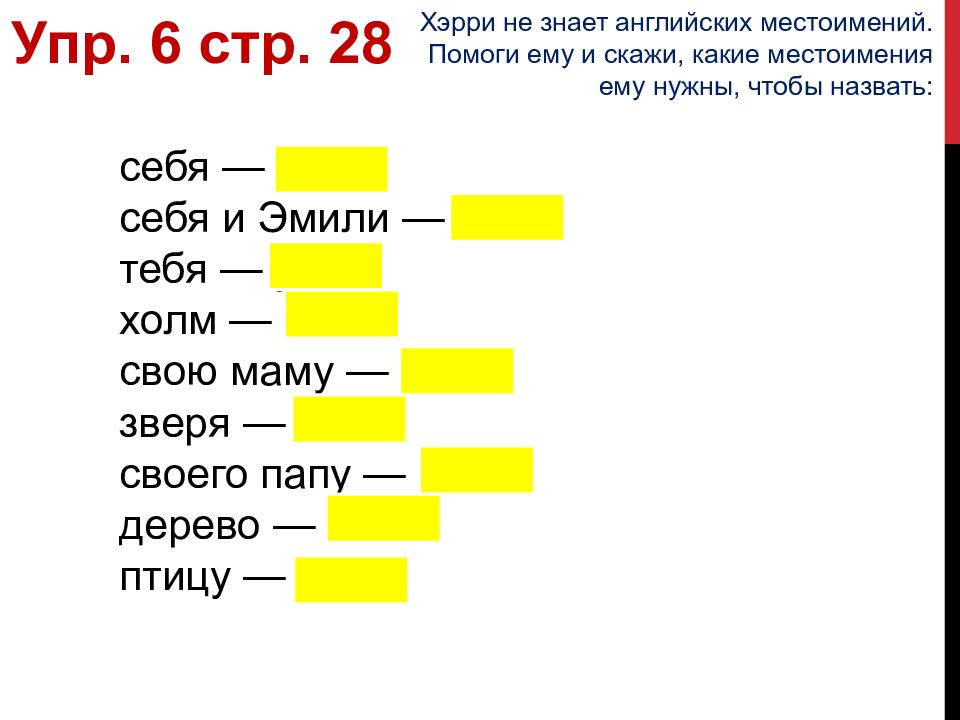 себя — I себя и Эмили — we тебя — you холм — it свою маму — she зверя — it своего папу — he дерево — it птицу — it Упр. 6 стр. 28 Хэрри не знает английских местоимений. Помоги ему и скажи, какие местоимения ему нужны, чтобы назвать: