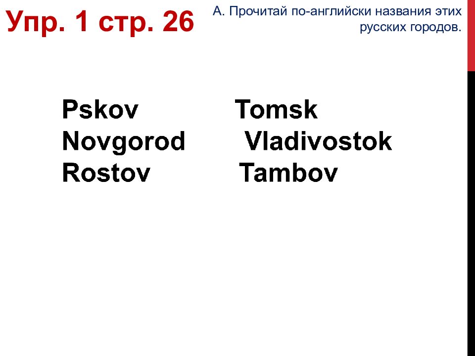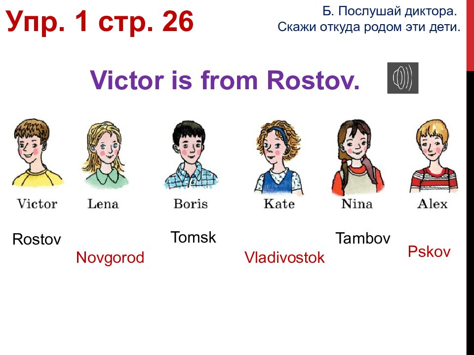 Victor is from Rostov. Rostov Novgorod Tomsk Vladivostok Tambov Pskov Упр. 1 стр. 26 Б. Послушай диктора. Скажи откуда родом эти дети.
