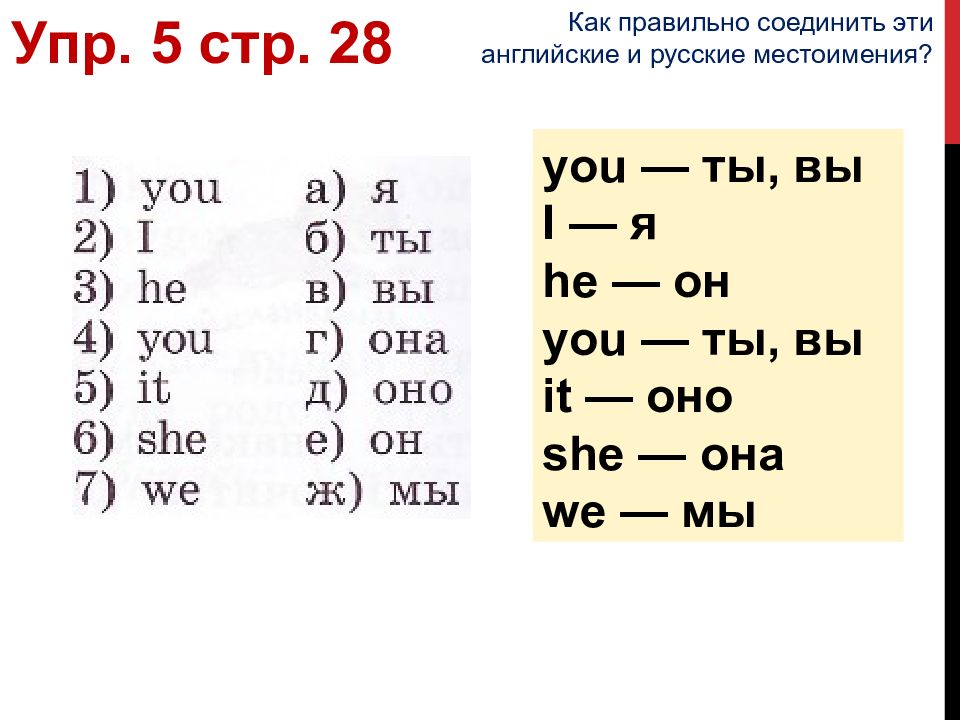 you — ты, вы I — я he — он you — ты, вы it — оно she — она we — мы Упр. 5 стр. 28 Как правильно соединить эти английские и русские местоимения?