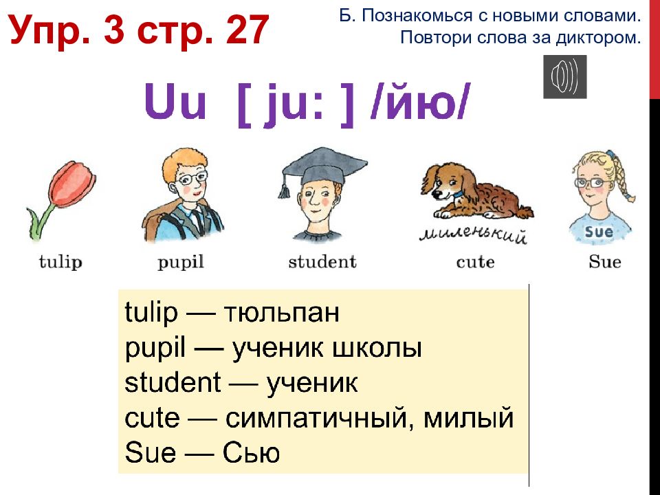 Упр. 3 стр. 27 Б. Познакомься с новыми словами. Повтори слова за диктором.