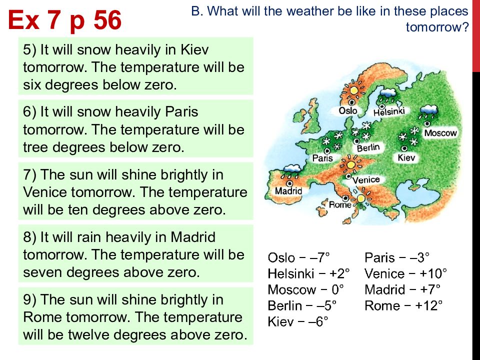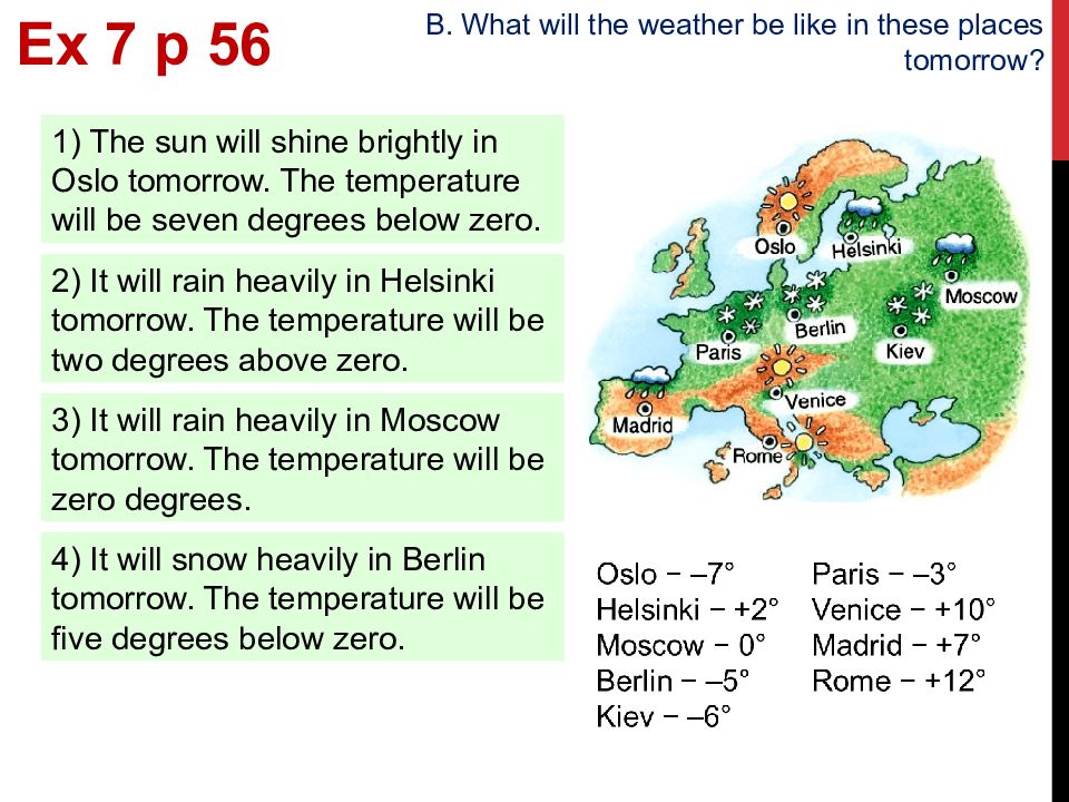 Ex 7 p 5 6 B. What will the weather be like in these places tomorrow? 1) The sun will shine brightly in Oslo tomorrow. The temperature will be seven degrees below zero. 2) It will rain heavily in Helsinki tomorrow. The temperature will be two degrees above zero. 3) It will rain heavily in Moscow tomorrow. The temperature will be zero degrees. 4) It will snow heavily in Berlin tomorrow. The temperature will be five degrees below zero.