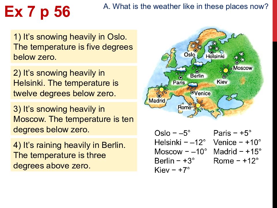 Ex 7 p 5 6 A. What is the weather like in these places now? 1) It’s snowing heavily in Oslo. The temperature is five degrees below zero. 2) It’s snowing heavily in Helsinki. The temperature is twelve degrees below zero. 3) It’s snowing heavily in Moscow. The temperature is ten degrees below zero. 4) It’s raining heavily in Berlin. The temperature is three degrees above zero.