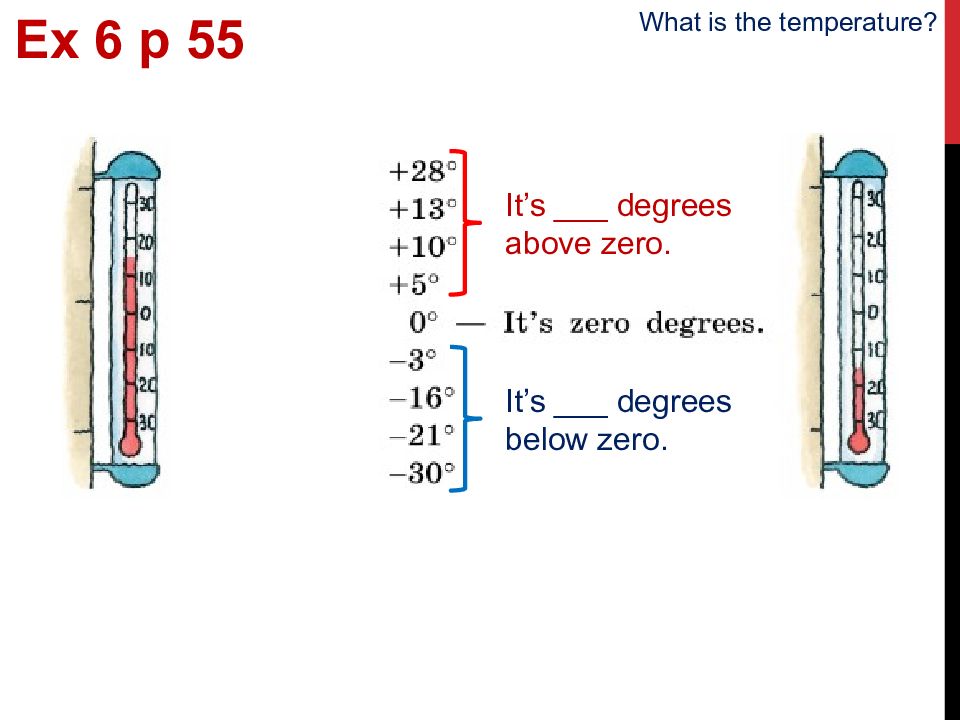 It’s ___ degrees above zero. It’s ___ degrees below zero. Ex 6 p 5 5 What is the temperature?