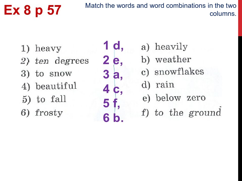 1 d, 2 e, 3 a, 4 c, 5 f, 6 b. Ex 8 p 5 7 Match the words and word combinations in the two columns.