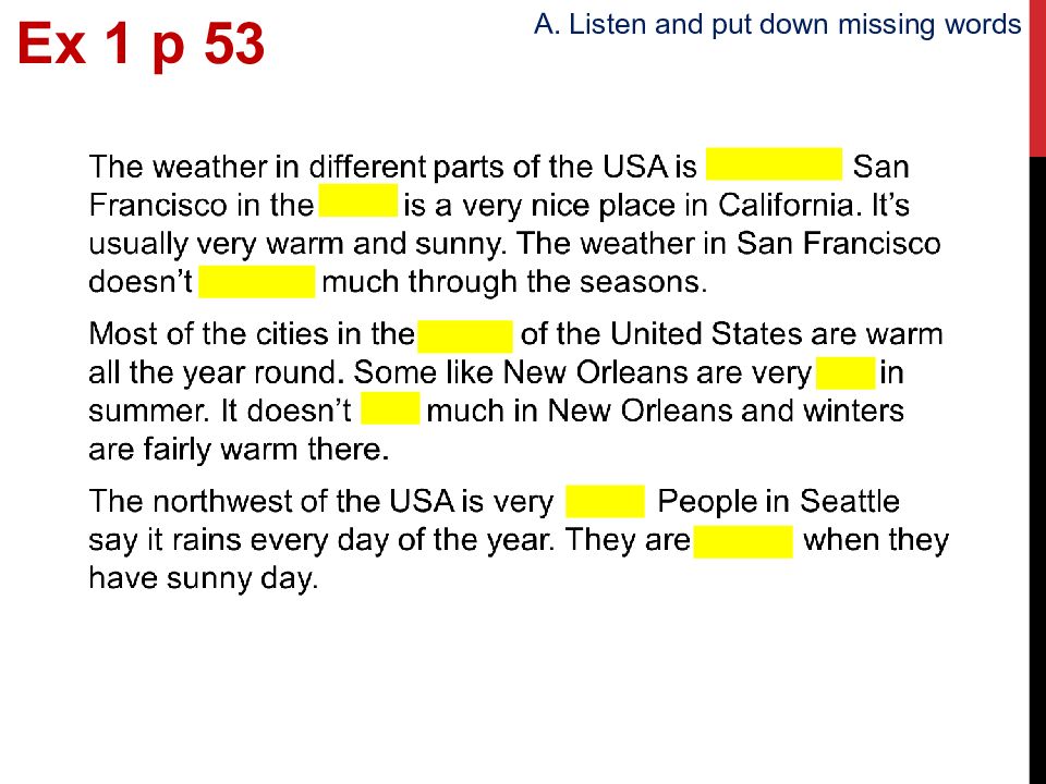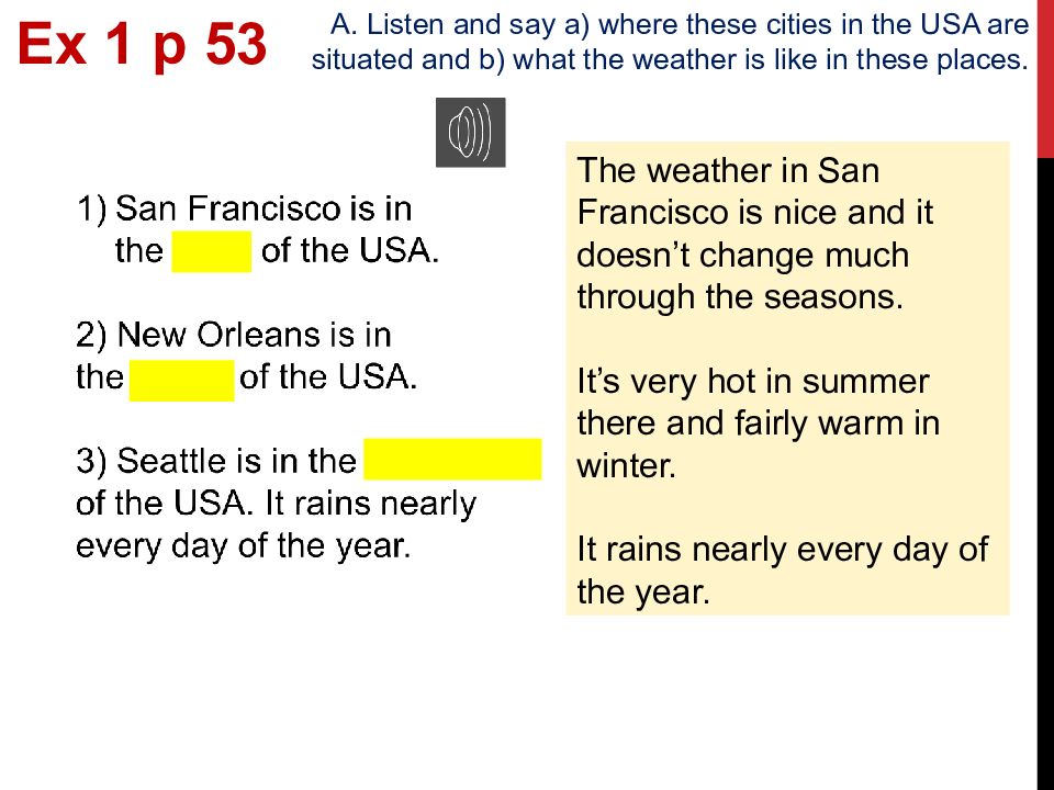 The weather in San Francisco is nice and it doesn’t change much through the seasons. It’s very hot in summer there and fairly warm in winter. It rains nearly every day of the year. Ex 1 p 53 A. Listen and say a) where these cities in the USA are situated and b) what the weather is like in these places.
