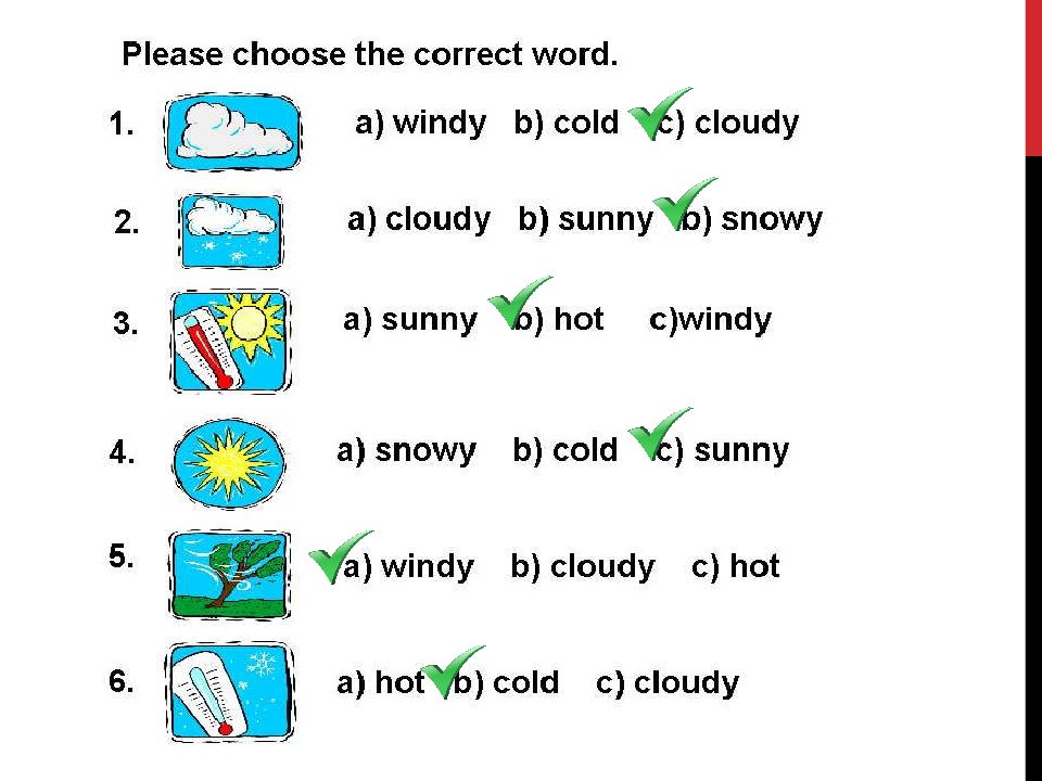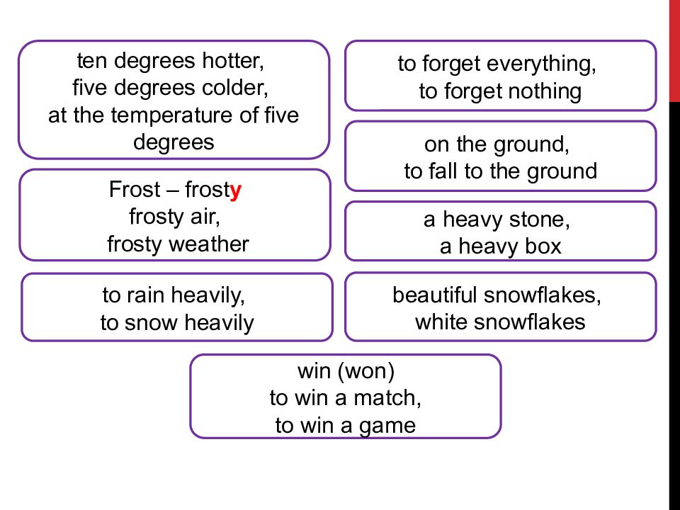ten degrees hotter, five degrees colder, at the temperature of five degrees to forget everything, to forget nothing Frost – frost y frosty air, frosty weather on the ground, to fall to the ground to rain heavily, to snow heavily a heavy stone, a heavy box beautiful snowflakes, white snowflakes win (won) to win a match, to win a game