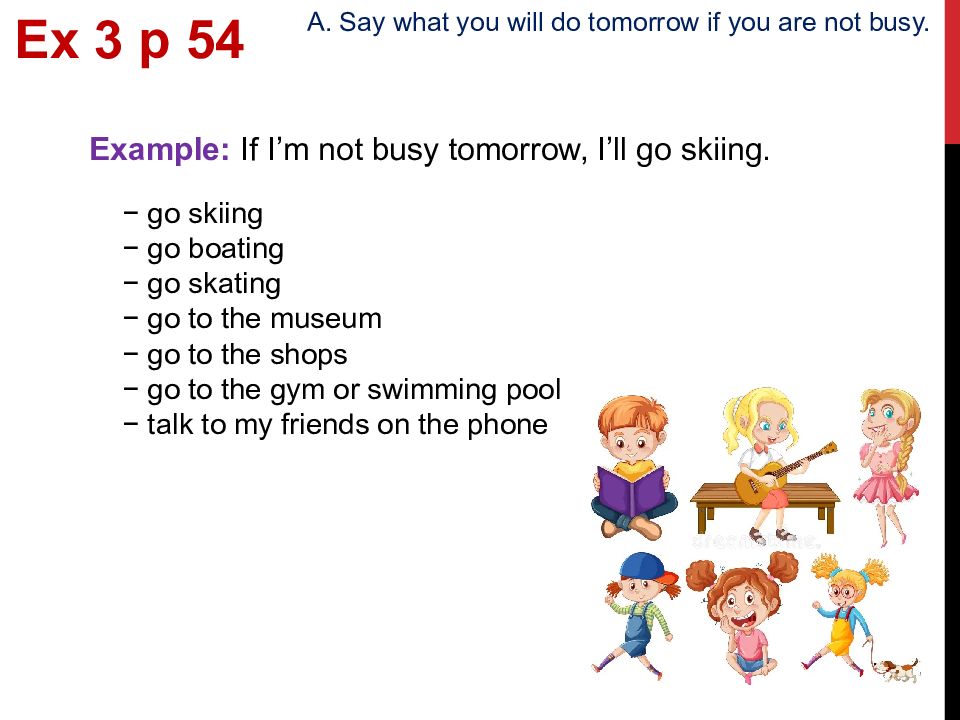 Ex 3 p 5 4 A. Say what you will do tomorrow if you are not busy. Example: If I’m not busy tomorrow, I’ll go skiing. − go skiing − go boating − go skating − go to the museum − go to the shops − go to the gym or swimming pool − talk to my friends on the phone