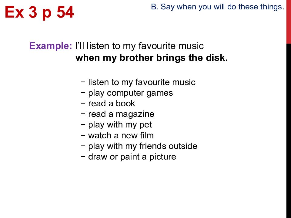 Ex 3 p 5 4 B. Say when you will do these things. Example: I’ll listen to my favourite music when my brother brings the disk. − listen to my favourite music − play computer games − read a book − read a magazine − play with my pet − watch a new film − play with my friends outside − draw or paint a picture