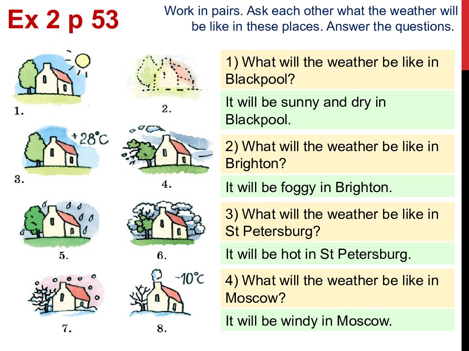 Ex 2 p 53 Work in pairs. Ask each other what the weather will be like in these places. Answer the questions. 1) What will the weather be like in Blackpool? It will be sunny and dry in Blackpool. 2) What will the weather be like in Brighton? It will be foggy in Brighton. 3) What will the weather be like in St Petersburg? It will be hot in St Petersburg. 4) What will the weather be like in Moscow? It will be windy in Moscow.