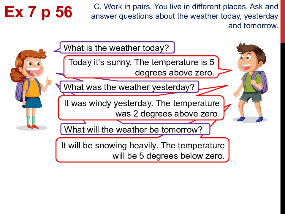 It will be snowing heavily. The temperature will be 5 degrees below zero. What will the weather be tomorrow? It was windy yesterday. The temperature was 2 degrees above zero. What was the weather yesterday? Ex 7 p 5 6 C. Work in pairs. You live in different places. Ask and answer questions about the weather today, yesterday and tomorrow. What is the weather today? Today it’s sunny. The temperature is 5 degrees above zero.