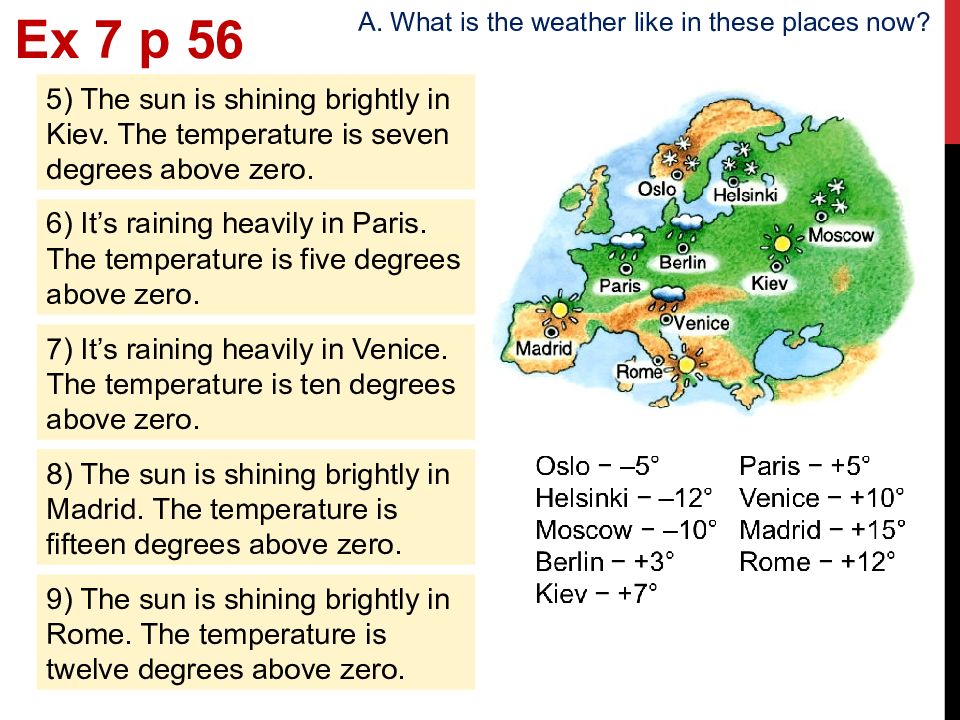 Ex 7 p 5 6 A. What is the weather like in these places now? 5) The sun is shining brightly in Kiev. The temperature is seven degrees above zero. 6) It’s raining heavily in Paris. The temperature is five degrees above zero. 7) It’s raining heavily in Venice. The temperature is ten degrees above zero. 8) The sun is shining brightly in Madrid. The temperature is fifteen degrees above zero. 9) The sun is shining brightly in Rome. The temperature is twelve degrees above zero.