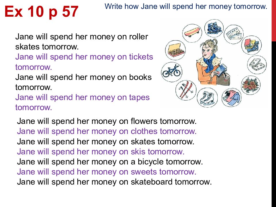 Ex 10 p 5 7 Write how Jane will spend her money tomorrow. Jane will spend her money on roller skates tomorrow. Jane will spend her money on tickets tomorrow. Jane will spend her money on books tomorrow. Jane will spend her money on tapes tomorrow. Jane will spend her money on flowers tomorrow. Jane will spend her money on clothes tomorrow. Jane will spend her money on skates tomorrow. Jane will spend her money on skis tomorrow. Jane will spend her money on a bicycle tomorrow. Jane will spend her money on sweets tomorrow. Jane will spend her money on skateboard tomorrow.