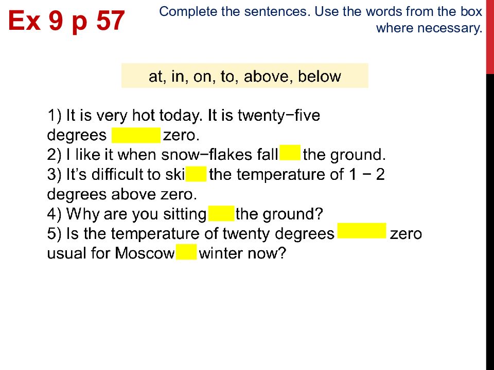 Ex 9 p 5 7 Complete the sentences. Use the words from the box where necessary.