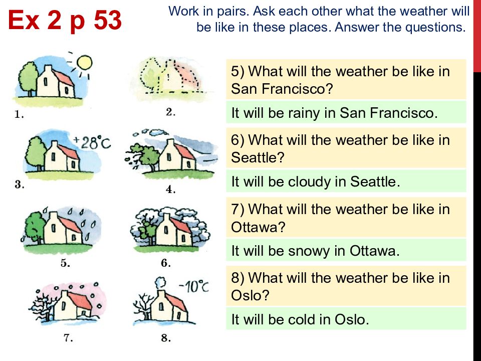 5) What will the weather be like in San Francisco? It will be rainy in San Francisco. 6) What will the weather be like in Seattle? It will be cloudy in Seattle. 7) What will the weather be like in Ottawa? It will be snowy in Ottawa. 8) What will the weather be like in Oslo? It will be cold in Oslo. Ex 2 p 53 Work in pairs. Ask each other what the weather will be like in these places. Answer the questions.