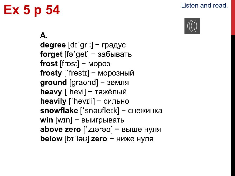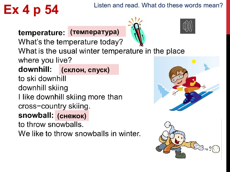 ( температура) ( склон, спуск) ( снежок) Ex 4 p 5 4 Listen and read. What do these words mean?
